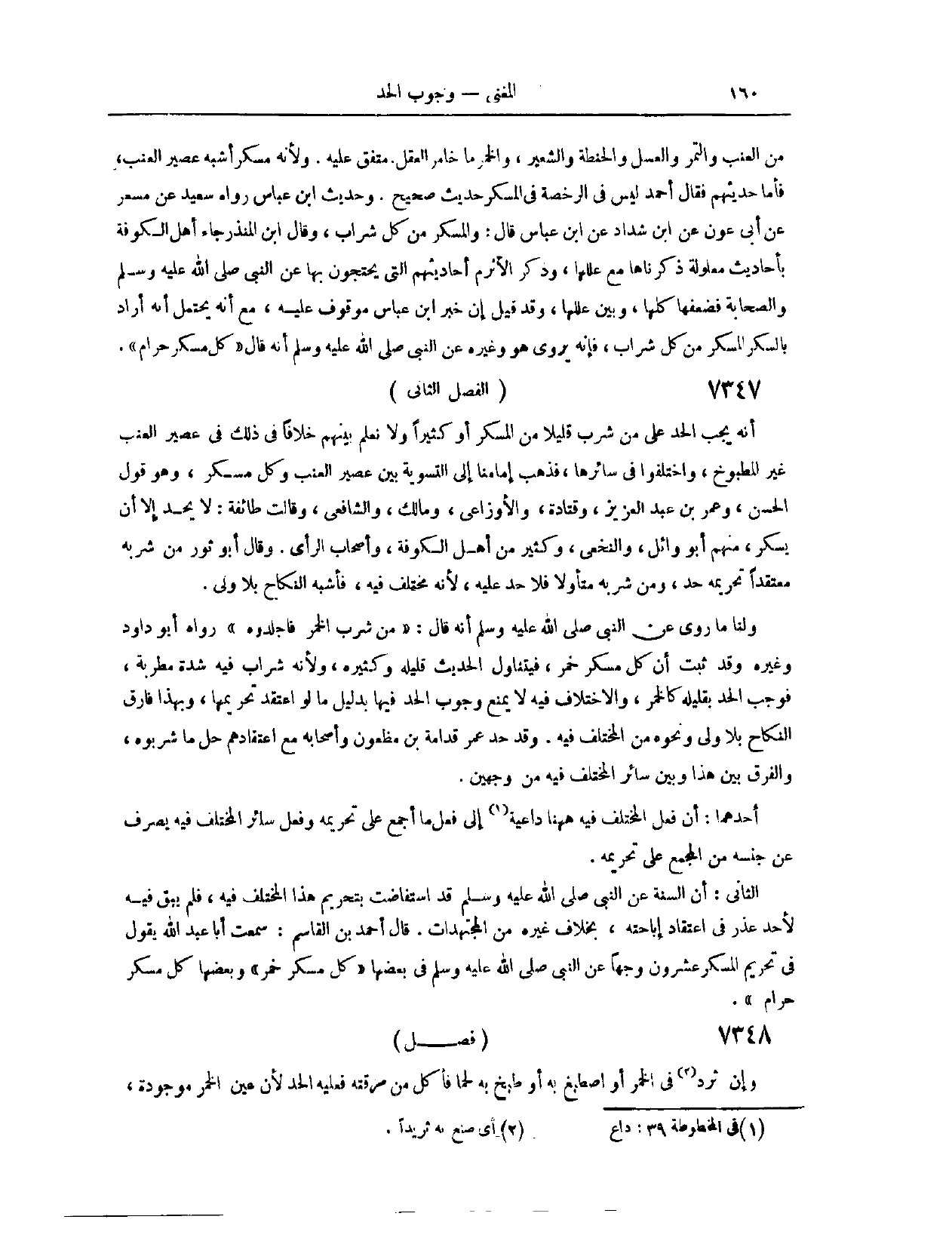 (٧٣٣٩) الْفَصْلُ الثَّانِي: أَنَّهُ يَجِبُ الْحَدُّ عَلَى مَنْ شَرِبَ قَلِيلًا مِنْ الْمُسْكِرِ أَوْ كَثِيرًا. وَلَا نَعْلَمُ بَيْنَهُمْ خِلَافًا فِي ذَلِكَ فِي عَصِيرِ الْعِنَبِ غَيْرِ الْمَطْبُوخِ، وَاخْتَلَفُوا فِي سَائِرِهَا، فَذَهَبَ إمَامُنَا إلَى التَّسْوِيَةِ بَيْنَ عَصِيرِ الْعِنَبِ وَكُلِّ مُسْكِرٍ. وَهُوَ قَوْلُ الْحَسَنِ، وَعُمَرَ بْنِ عَبْدِ الْعَزِيزِ، وَقَتَادَةَ، وَالْأَوْزَاعِيِّ، وَمَالِكٍ، وَالشَّافِعِيِّ. وَقَالَتْ طَائِفَةٌ لَا يُحَدُّ، إلَّا أَنْ يَسْكَرَ؛ مِنْهُمْ أَبُو وَائِلٍ، وَالنَّخَعِيُّ، وَكَثِيرٌ مِنْ أَهْلِ الْكُوفَةِ، وَأَصْحَابُ الرَّأْيِ. وَقَالَ أَبُو ثَوْرٍ: مَنْ شَرِبَهُ مُعْتَقِدًا تَحْرِيمَهُ حُدَّ. وَمَنْ شَرِبَهُ مُتَأَوِّلًا، فَلَا حَدَّ عَلَيْهِ؛ لِأَنَّهُ مُخْتَلَفٌ فِيهِ، فَأَشْبَهَ النِّكَاحَ بِلَا وَلِيٍّ.