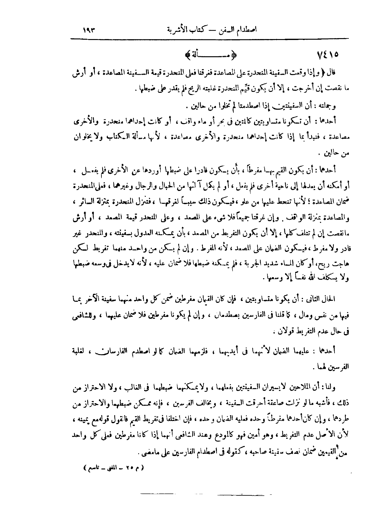 (٧٤٠٧) مَسْأَلَةٌ: قَالَ: (وَإِذَا وَقَعَتْ السَّفِينَة الْمُنْحَدِرَةُ عَلَى الْمُصَاعَدَةِ، فَغَرِقَتَا، فَعَلَى الْمُنْحَدِرَةِ قِيمَةُ السَّفِينَةِ الْمُصَاعَدَةِ، أَوْ أَرْشُ مَا نَقَصَتْ إنْ أُخْرِجَتْ، إلَّا أَنْ يَكُونَ قَيِّمُ الْمُنْحَدِرَةِ غَلَبَتْهُ الرِّيحُ، فَلَمْ يَقْدِرْ عَلَى ضَبْطِهَا)
