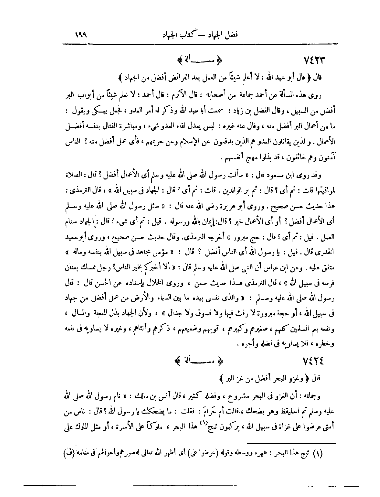 (٧٤١٦) قَالَ: (قَالَ أَبُو عَبْدِ اللَّهِ: لَا أَعْلَمُ شَيْئًا مِنْ الْعَمَلِ بَعْدَ الْفَرَائِضِ أَفْضَلَ مِنْ الْجِهَادِ) رَوَى هَذِهِ الْمَسْأَلَةَ عَنْ أَحْمَدَ جَمَاعَةٌ مِنْ أَصْحَابِهِ، قَالَ الْأَثْرَمُ: قَالَ أَحْمَدُ: لَا نَعْلَمُ شَيْئًا مِنْ أَبْوَابِ الْبِرِّ أَفْضَلَ مِنْ السَّبِيلِ. وَقَالَ الْفَضْلُ بْنُ زِيَادٍ: سَمِعْت أَبَا عَبْدِ اللَّهِ، وَذُكِرَ لَهُ أَمْرُ الْعَدُوِّ؟ فَجَعَلَ يَبْكِي، وَيَقُولُ: مَا مِنْ أَعْمَالِ الْبِرِّ أَفْضَلَ مِنْهُ.
