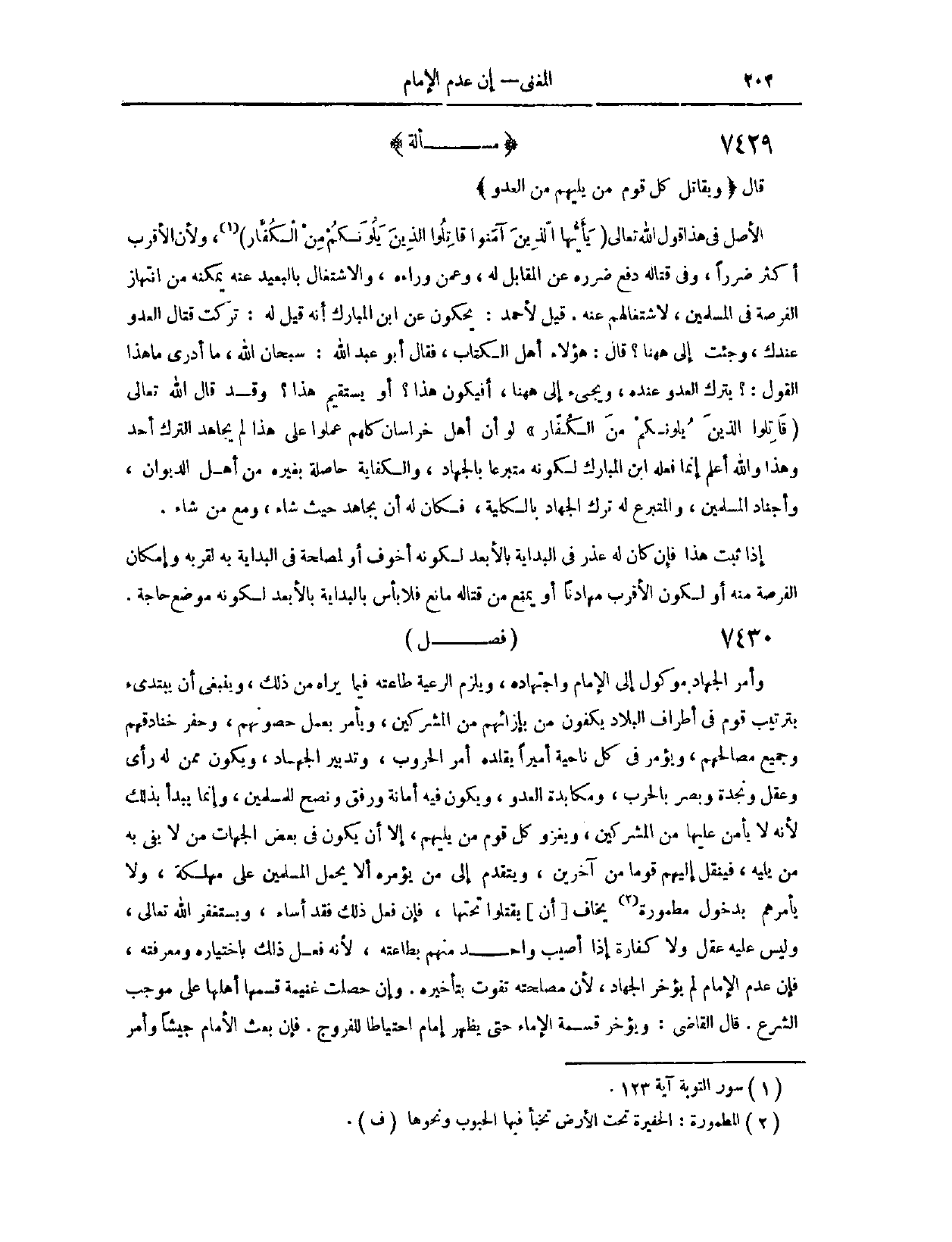 (٧٤٢٢) : (وَيُقَاتِلُ كُلُّ قَوْمٍ مَنْ يَلِيهِمْ مِنْ الْعَدُوِّ) . الْأَصْلُ فِي هَذَا قَوْلُ اللَّهِ تَعَالَى {يَا أَيُّهَا الَّذِينَ آمَنُوا قَاتِلُوا الَّذِينَ يَلُونَكُمْ مِنَ الْكُفَّارِ} [التوبة: ١٢٣] وَلِأَنَّ الْأَقْرَبَ أَكْثَرُ ضَرَرًا، وَفِي قِتَالِهِ دَفْعُ ضَرَرِهِ عَنْ الْمُقَابِلِ لَهُ، وَعَمَّنْ وَرَاءَهُ، وَالِاشْتِغَالُ بِالْبَعِيدِ عَنْهُ، يُمَكِّنُهُ مِنْ انْتِهَازِ الْفُرْصَةِ فِي الْمُسْلِمِينَ؛ لِاشْتِغَالِهِمْ عَنْهُ. قِيلَ لِأَحْمَدْ: يَحْكُونَ عَنْ ابْنِ الْمُبَارَكِ أَنَّهُ قِيلَ لَهُ: تَرَكْت قِتَالَ الْعَدُوِّ عِنْدَك، وَجِئْت إلَى هَاهُنَا؟ قَالَ: هَؤُلَاءِ أَهْلُ الْكِتَابِ.