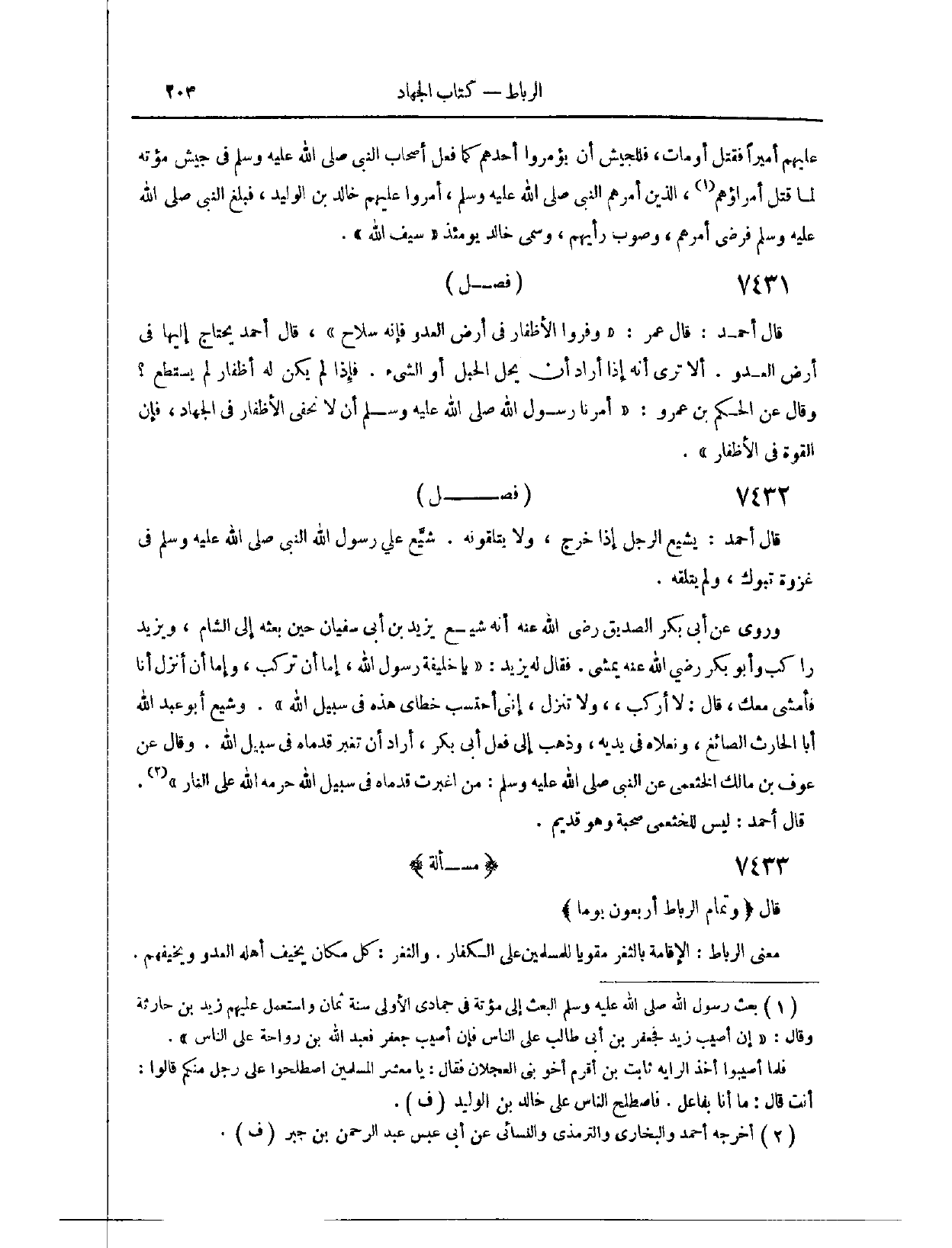 عَلَيْهِمْ أَمِيرًا، فَقُتِلَ أَوْ مَاتَ، فَلِلْجَيْشِ أَنْ يُؤَمِّرُوا أَحَدَهُمْ، كَمَا فَعَلَ أَصْحَابُ النَّبِيِّ - صَلَّى اللَّهُ عَلَيْهِ وَسَلَّمَ - فِي جَيْشِ مُؤْتَةَ، لَمَّا قُتِلَ أُمَرَاؤُهُمْ الَّذِينَ أَمَّرَهُمْ النَّبِيُّ - صَلَّى اللَّهُ عَلَيْهِ وَسَلَّمَ - أَمَّرُوا عَلَيْهِمْ خَالِدَ بْنَ الْوَلِيدِ، فَبَلَغَ النَّبِيَّ - صَلَّى اللَّهُ عَلَيْهِ وَسَلَّمَ - فَرَضِيَ أَمْرَهُمْ، وَصَوَّبَ رَأْيَهُمْ، وَسَمَّى خَالِدًا يَوْمَئِذٍ: " سَيْفَ اللَّهِ ".