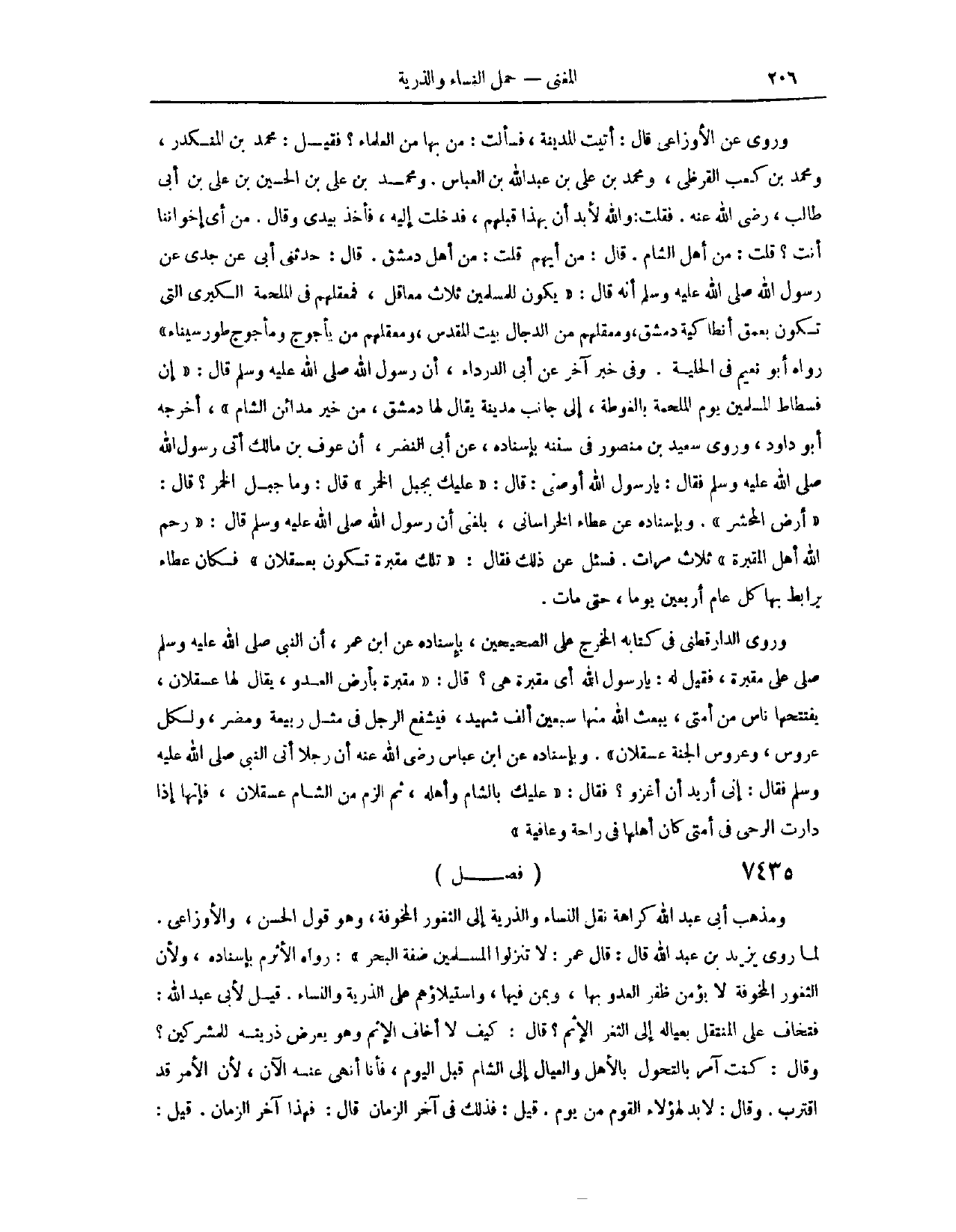 وَرُوِيَ عَنْ الْأَوْزَاعِيِّ، قَالَ: أَتَيْت الْمَدِينَةَ، فَسَأَلْت: مَنْ بِهَا مِنْ الْعُلَمَاءِ؟ فَقِيلَ: مُحَمَّدُ بْنُ الْمُنْكَدِرِ، وَمُحَمَّدُ بْنُ كَعْبٍ الْقُرَظِيّ، وَمُحَمَّدُ بْنُ عَلِيِّ بْنِ عَبْدِ اللَّهِ بْنِ الْعَبَّاسِ، وَمُحَمَّدُ بْنُ عَلِيِّ بْنِ الْحُسَيْنِ بْنِ عَلِيِّ بْنِ أَبِي طَالِبٍ - رَضِيَ اللَّهُ عَنْهُ -. فَقُلْت: وَاَللَّهِ لَأَبْدَأَنَّ بِهَذَا قَبْلَهُمْ. فَدَخَلْت إلَيْهِ، فَأَخَذَ بِيَدِي، وَقَالَ: مِنْ أَيِّ إخْوَانِنَا أَنْتَ؟ قُلْت: مِنْ أَهْلِ الشَّامِ. قَالَ: مِنْ أَيِّهِمْ؟ قُلْت: مِنْ أَهْلِ دِمَشْقَ. قَالَ: حَدَّثَنِي أَبِي، عَنْ جَدِّي، عَنْ رَسُولِ اللَّهِ - صَلَّى اللَّهُ عَلَيْهِ وَسَلَّمَ - أَنَّهُ قَالَ: «يَكُونُ لِلْمُسْلِمِينَ ثَلَاثُ مَعَاقِلَ؛ فَمَعْقِلُهُمْ فِي الْمَلْحَمَةِ الْكُبْرَى الَّتِي تَكُونُ بِعُمْقِ أَنْطَاكِيَةَ دِمَشْقُ، وَمَعْقِلُهُمْ مِنْ الدَّجَّالِ بَيْتُ الْمَقْدِسِ، وَمَعْقِلُهُمْ مِنْ يَأْجُوجَ وَمَأْجُوجَ طُورُ سَيْنَاءَ» . رَوَاهُ أَبُو نُعَيْمٍ، فِي " الْحِلْيَةِ "، وَفِي خَبَرٍ آخَرَ، عَنْ أَبِي الدَّرْدَاءِ، أَنَّ رَسُولَ اللَّهِ - صَلَّى اللَّهُ عَلَيْهِ وَسَلَّمَ - قَالَ: «إنَّ فُسْطَاطَ الْمُسْلِمِينَ يَوْمَ الْمَلْحَمَةِ بِالْغُوطَةِ، إلَى جَانِبِ مَدِينَةٍ يُقَالُ لَهَا: دِمَشْقُ، مِنْ خَيْرِ مَدَائِنِ الشَّامِ.» أَخْرَجَهُ أَبُو دَاوُد.