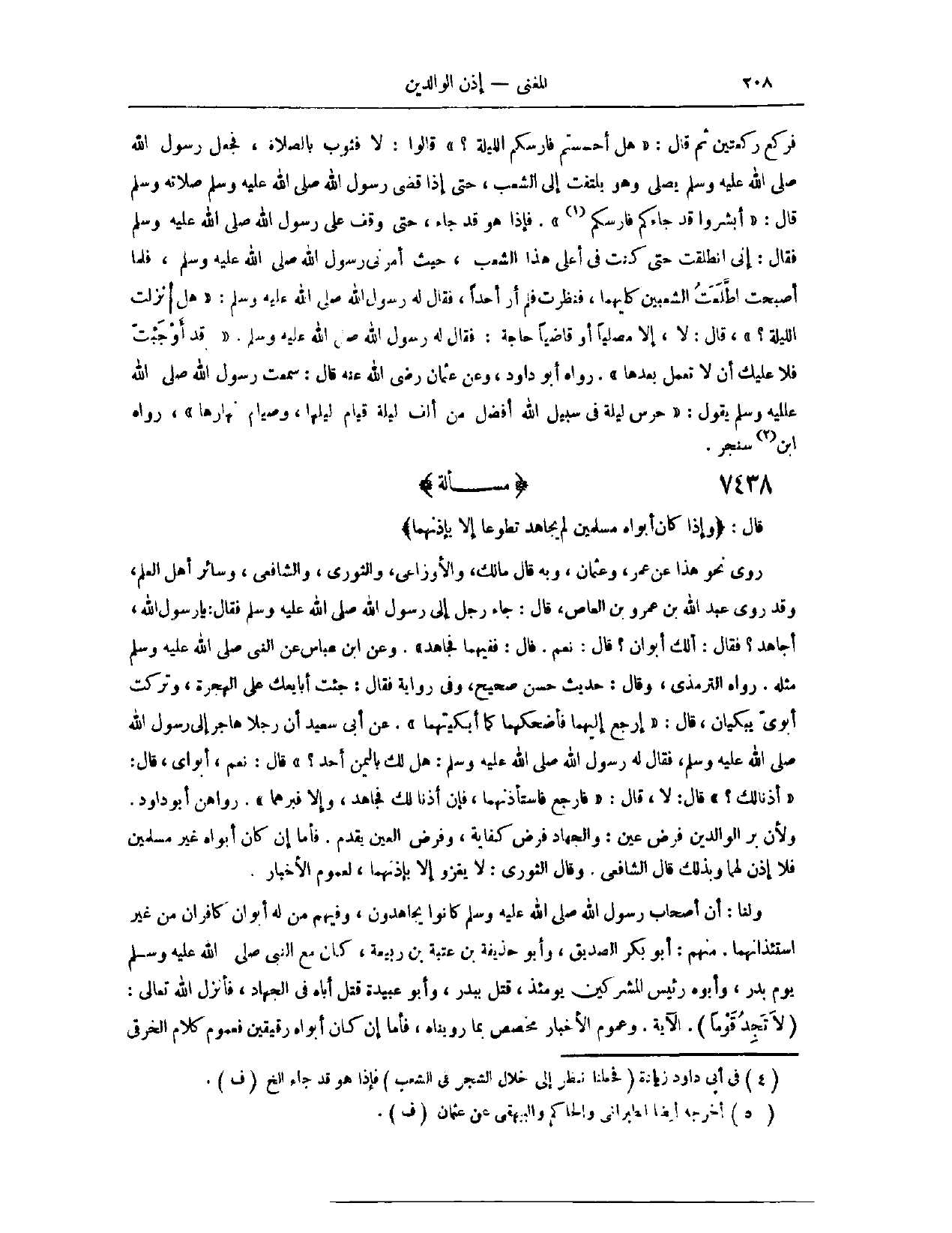(٧٤٣١) : (وَإِذَا كَانَ أَبَوَاهُ مُسْلِمَيْنِ، لَمْ يُجَاهِدْ تَطَوُّعًا إلَّا بِإِذْنِهِمَا) رُوِيَ نَحْوُ هَذَا عَنْ عُمَرَ، وَعُثْمَانَ. وَبِهِ قَالَ مَالِكٌ، وَالْأَوْزَاعِيُّ، وَالثَّوْرِيُّ، وَالشَّافِعِيُّ، وَسَائِرُ أَهْلِ الْعِلْمِ. وَقَدْ رَوَى عَبْدُ اللَّهِ بْنُ عَمْرِو بْنِ الْعَاصِ، قَالَ: «جَاءَ رَجُلٌ إلَى رَسُولِ اللَّهِ - صَلَّى اللَّهُ عَلَيْهِ وَسَلَّمَ - فَقَالَ: يَا رَسُولَ اللَّهِ أُجَاهِدُ؟ فَقَالَ: أَلَك أَبَوَانِ؟ قَالَ: نَعَمْ. قَالَ: فَفِيهِمَا فَجَاهِدْ.» . وَعَنْ ابْنِ عَبَّاسٍ، عَنْ النَّبِيِّ - صَلَّى اللَّهُ عَلَيْهِ وَسَلَّمَ - مِثْلُهُ، رَوَاهُ التِّرْمِذِيُّ. وَقَالَ: حَدِيثٌ حَسَنٌ صَحِيحٌ. وَفِي رِوَايَةٍ: «فَقَالَ: جِئْت أُبَايِعُك عَلَى الْهِجْرَةِ، وَتَرَكْت أَبَوَيَّ يَبْكِيَانِ. قَالَ: ارْجِعْ إلَيْهِمَا، فَأَضْحِكْهُمَا كَمَا أَبْكَيْتَهُمَا.» وَعَنْ أَبِي سَعِيدٍ، «أَنَّ رَجُلًا هَاجَرَ إلَى رَسُولِ اللَّهِ - صَلَّى اللَّهُ عَلَيْهِ وَسَلَّمَ - فَقَالَ لَهُ رَسُولُ اللَّهِ - صَلَّى اللَّهُ عَلَيْهِ وَسَلَّمَ -: هَلْ لَك بِالْيَمَنِ أَحَدٌ؟ قَالَ: نَعَمْ، أَبَوَايَ. قَالَ: أَذِنَّا لَك؟ قَالَ: لَا. قَالَ: فَارْجِعْ، فَاسْتَأْذِنْهُمَا، فَإِنْ أَذِنَا لَك فَجَاهِدْ، وَإِلَّا فَبِرَّهُمَا.» رَوَاهُنَّ أَبُو دَاوُد. وَلِأَنَّ بِرَّ الْوَالِدَيْنِ فَرْضُ عَيْنٍ، وَالْجِهَادَ فَرْضُ كِفَايَةٍ، وَفَرْضُ الْعَيْنِ يُقَدَّمُ.