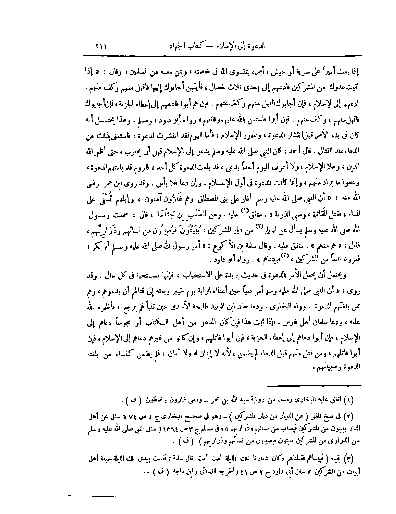 وَقَالَ سَلَمَةُ بْنُ الْأَكْوَعِ: «أَمَّرَ رَسُولُ اللَّهِ - صَلَّى اللَّهُ عَلَيْهِ وَسَلَّمَ - أَبَا بَكْرٍ، فَغَزَوْنَا نَاسًا مِنْ الْمُشْرِكِينَ، فَبَيَّتْنَاهُمْ.» رَوَاهُ أَبُو دَاوُد، وَيَحْتَمِلُ أَنْ يُجْعَلَ الْأَمْرُ بِالدَّعْوَةِ فِي حَدِيثِ بُرَيْدَةَ عَلَى الِاسْتِحْبَابِ، فَإِنَّهَا مُسْتَحَبَّةٌ فِي كُلِّ حَالٍ، وَقَدْ رُوِيَ أَنَّ النَّبِيَّ - صَلَّى اللَّهُ عَلَيْهِ وَسَلَّمَ - «أَمَّرَ عَلِيًّا، حِينَ أَعْطَاهُ الرَّايَةَ يَوْمَ خَيْبَرَ وَبَعَثَهُ إلَى قِتَالِهِمْ، أَنْ يَدْعُوَهُمْ، وَهُمْ مِمَّنْ بَلَغَتْهُمْ الدَّعْوَةُ» . رَوَاهُ الْبُخَارِيُّ. وَدَعَا خَالِدُ بْنُ الْوَلِيدِ طُلَيْحَةَ الْأَسَدِيَّ حِينَ تَنَبَّأَ، فَلَمْ يَرْجِعْ، فَأَظْهَرَهُ اللَّهُ عَلَيْهِ، وَدَعَا سَلْمَانُ أَهْلَ فَارِسَ. فَإِذَا ثَبَتَ هَذَا، فَإِنْ كَانَ الْمَدْعُوُّ مِنْ أَهْلِ الْكِتَابِ، أَوْ مَجُوسًا، دَعَاهُمْ إلَى الْإِسْلَامِ، فَإِنْ أَبَوْا، دَعَاهُمْ إلَى إعْطَاءِ الْجِزْيَةِ، فَإِنْ أَبَوْا قَاتَلَهُمْ، وَإِنْ كَانُوا مِنْ غَيْرِهِمْ، دَعَاهُمْ إلَى الْإِسْلَامِ، فَإِنْ أَبَوْا، قَاتَلَهُمْ، وَمَنْ قُتِلَ قَبْلَ الدُّعَاءِ لَمْ يُضْمَنْ؛ لِأَنَّهُ لَا إيمَانَ لَهُ وَلَا أَمَانَ، فَلَمْ يُضْمَنْ، كَنِسَاءِ مَنْ بَلَغَتْهُ الدَّعْوَةُ وَصِبْيَانِهِمْ.