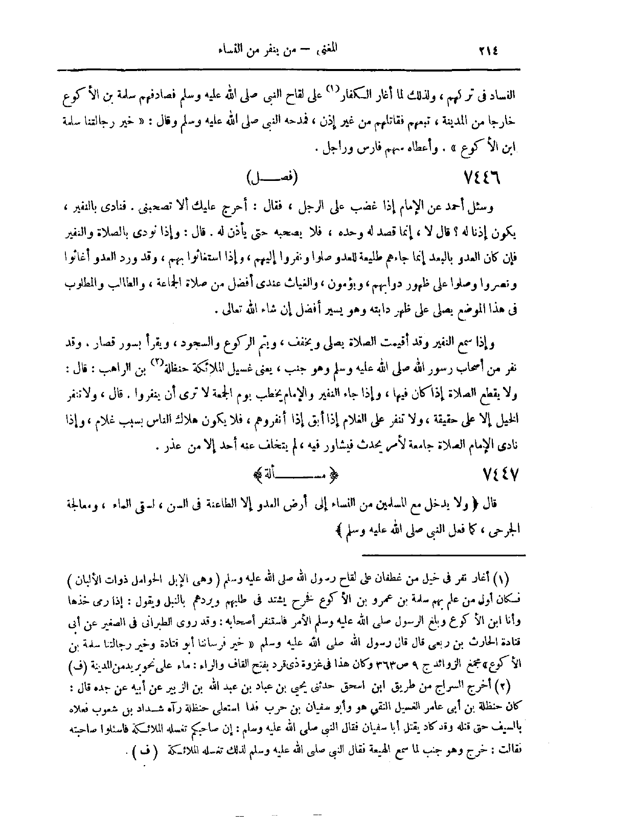 (٧٤٣٩) فَصْلٌ وَسُئِلَ أَحْمَدُ عَنْ الْإِمَامِ إذَا غَضِبَ عَلَى الرَّجُلِ، فَقَالَ: اُخْرُجْ، عَلَيْك أَنْ لَا تَصْحَبَنِي. فَنَادَى بِالنَّفِيرِ، يَكُونُ إذْنًا لَهُ؟ قَالَ: لَا، إنَّمَا قَصَدَ لَهُ وَحْدَهُ، فَلَا يَصْحَبُهُ حَتَّى يَأْذَنَ لَهُ. قَالَ: وَإِذَا نُودِيَ بِالصَّلَاةِ وَالنَّفِيرِ، فَإِنْ كَانَ الْعَدُوُّ بِالْبُعْدِ، إنَّمَا جَاءَهُمْ طَلِيعَةٌ لِلْعَدُوِّ، صَلَّوْا وَنَفَرُوا إلَيْهِمْ، وَإِذَا اسْتَغَاثُوا بِهِمْ، وَقَدْ وَرَدَ الْعَدُوُّ، أَغَاثُوا وَنَصَرُوا وَصَلَّوْا عَلَى ظُهُورِ دَوَابِّهِمْ وَيُومِئُونَ، وَالْغِيَاثُ عِنْدِي أَفْضَلُ مِنْ صَلَاةِ الْجَمَاعَةِ، وَالطَّالِبُ وَالْمَطْلُوبُ فِي هَذَا الْمَوْضِعِ يُصَلِّي عَلَى ظَهْرِ دَابَّتِهِ وَهُوَ يَسِيرُ أَفْضَلُ إنْ شَاءَ اللَّهُ تَعَالَى، وَإِذَا سَمِعَ النَّفِيرَ، وَقَدْ أُقِيمَتْ الصَّلَاةُ، يُصَلِّي، وَيُخَفِّفُ، وَيُتِمُّ الرُّكُوعَ وَالسُّجُودَ وَيَقْرَأُ بِسُوَرٍ قِصَارٍ.