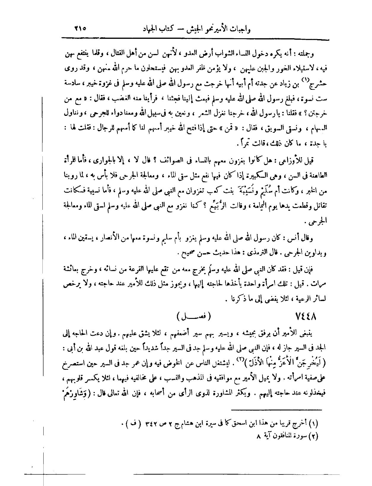 (٧٤٤١) فَصْلٌ يَنْبَغِي لِلْأَمِيرِ أَنْ يَرْفُقَ بِجَيْشِهِ، وَيَسِيرُ بِهِمْ سَيْرَ أَضْعَفِهِمْ، لِئَلَّا يَشُقَّ عَلَيْهِمْ، وَإِنْ دَعَتْ الْحَاجَةُ إلَى الْجِدِّ فِي السَّيْرِ جَازَ لَهُ فَإِنَّ النَّبِيَّ - صَلَّى اللَّهُ عَلَيْهِ وَسَلَّمَ - «جَدَّ فِي السَّيْرِ جَدًّا شَدِيدًا، حِينَ بَلَغَهُ قَوْلُ عَبْدِ اللَّهِ بْنِ أُبَيٍّ: لَيُخْرِجَنَّ الْأَعَزُّ مِنْهَا الْأَذَلَّ. لِيَشْتَغِلَ النَّاسُ عَنْ الْخَوْضِ فِيهِ» . وَإِنَّ ابْنَ عُمَرَ جَدَّ فِي السَّيْرِ حِينَ اسْتَصْرَخَ عَلَى صَفِيَّةَ امْرَأَتِهِ.