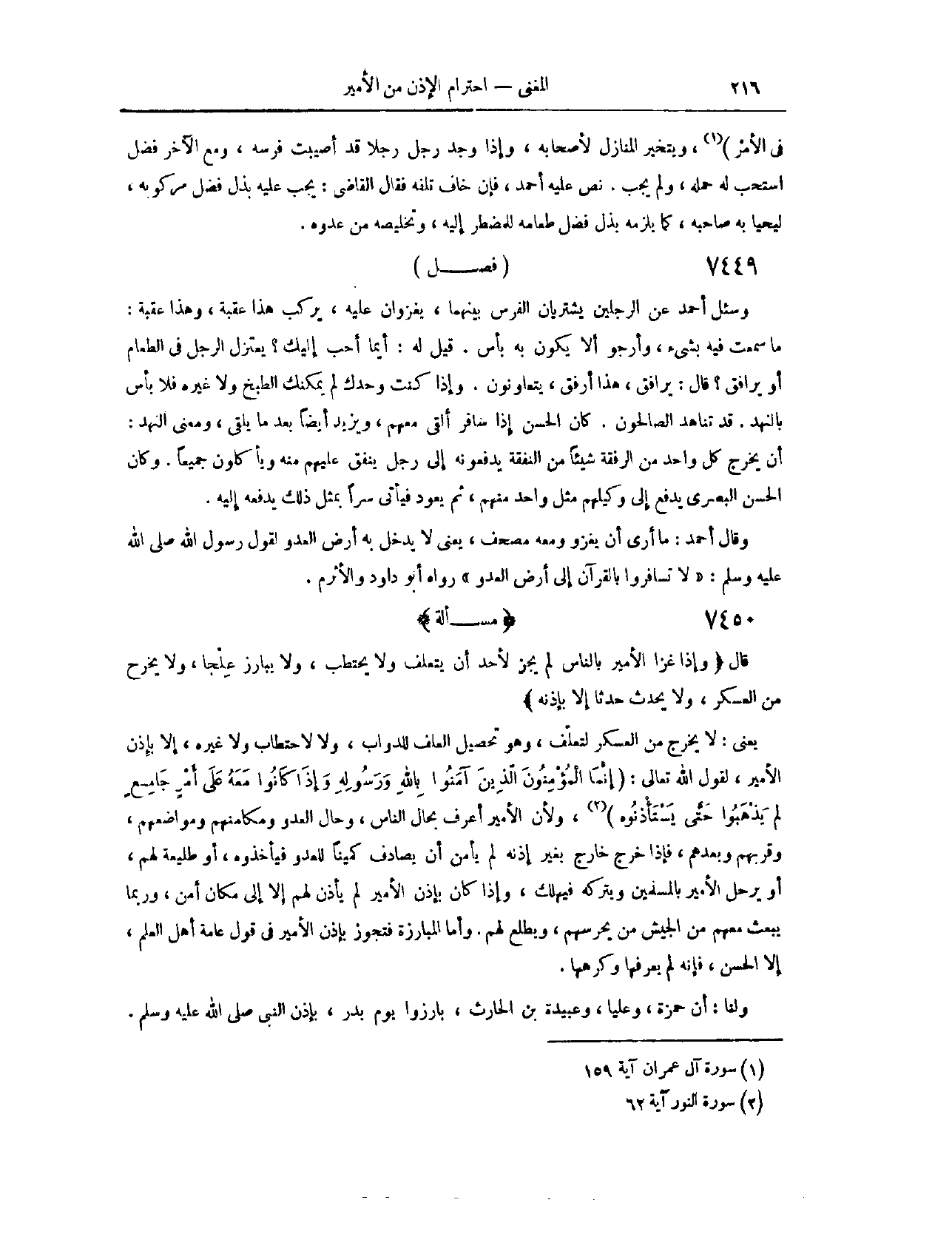 (٧٤٤٣) مَسْأَلَةٌ وَإِذَا غَزَا الْأَمِيرُ بِالنَّاسِ، لَمْ يَجُزْ لِأَحَدٍ أَنْ يَتَعَلَّفَ، وَلَا يَحْتَطِبَ، وَلَا يُبَارِزَ عِلْجًا، وَلَا يَخْرُجَ مِنْ الْعَسْكَرِ، وَلَا يُحْدِثَ حَدَثًا، إلَّا بِإِذْنِهِ يَعْنِي لَا يَخْرُجُ مِنْ الْعَسْكَرِ لِتَعَلُّفٍ، وَهُوَ تَحْصِيلُ الْعَلَفِ لِلدَّوَابِّ، وَلَا لِاحْتِطَابٍ، وَلَا غَيْرِهِ إلَّا بِإِذْنِ الْأَمِيرِ؛ لِقَوْلِ اللَّهِ تَعَالَى: {إِنَّمَا الْمُؤْمِنُونَ الَّذِينَ آمَنُوا بِاللَّهِ وَرَسُولِهِ} [النور: ٦٢] {وَإِذَا كَانُوا مَعَهُ عَلَى أَمْرٍ جَامِعٍ لَمْ يَذْهَبُوا حَتَّى يَسْتَأْذِنُوهُ} [النور: ٦٢] .
