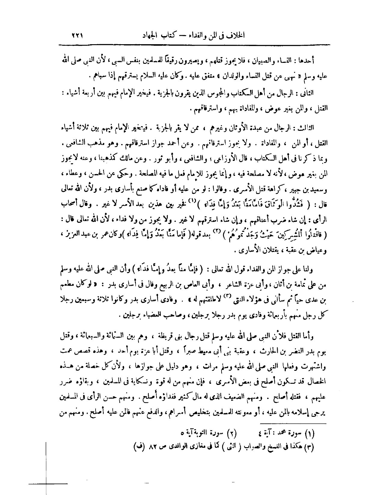 وَلَنَا، عَلَى جَوَازِ الْمَنِّ وَالْفِدَاءِ قَوْلُ اللَّهِ تَعَالَى: {فَإِمَّا مَنًّا بَعْدُ وَإِمَّا فِدَاءً} [محمد: ٤] . وَأَنَّ النَّبِيَّ - صَلَّى اللَّهُ عَلَيْهِ وَسَلَّمَ - مَنَّ عَلَى ثُمَامَةَ بْنِ أُثَالٍ، وَأَبِي عَزَّةَ الشَّاعِرِ، وَأَبِي الْعَاصِ بْنِ الرَّبِيعِ، وَقَالَ فِي أُسَارَى بَدْرٍ: لَوْ كَانَ مُطْعِمُ بْنُ عَدِيٍّ حَيًّا، ثُمَّ سَأَلَنِي فِي هَؤُلَاءِ النَّتْنَى، لَأَطْلَقْتهمْ لَهُ. وَفَادَى أُسَارَى بَدْرٍ، وَكَانُوا ثَلَاثَةً وَسَبْعِينَ رَجُلًا، كُلُّ رَجُلٍ مِنْهُمْ بِأَرْبَعِمِائَةٍ، وَفَادَى يَوْمَ بَدْرٍ رَجُلًا بِرَجُلَيْنِ، وَصَاحِبَ الْعَضْبَاءِ بِرَجُلَيْنِ.