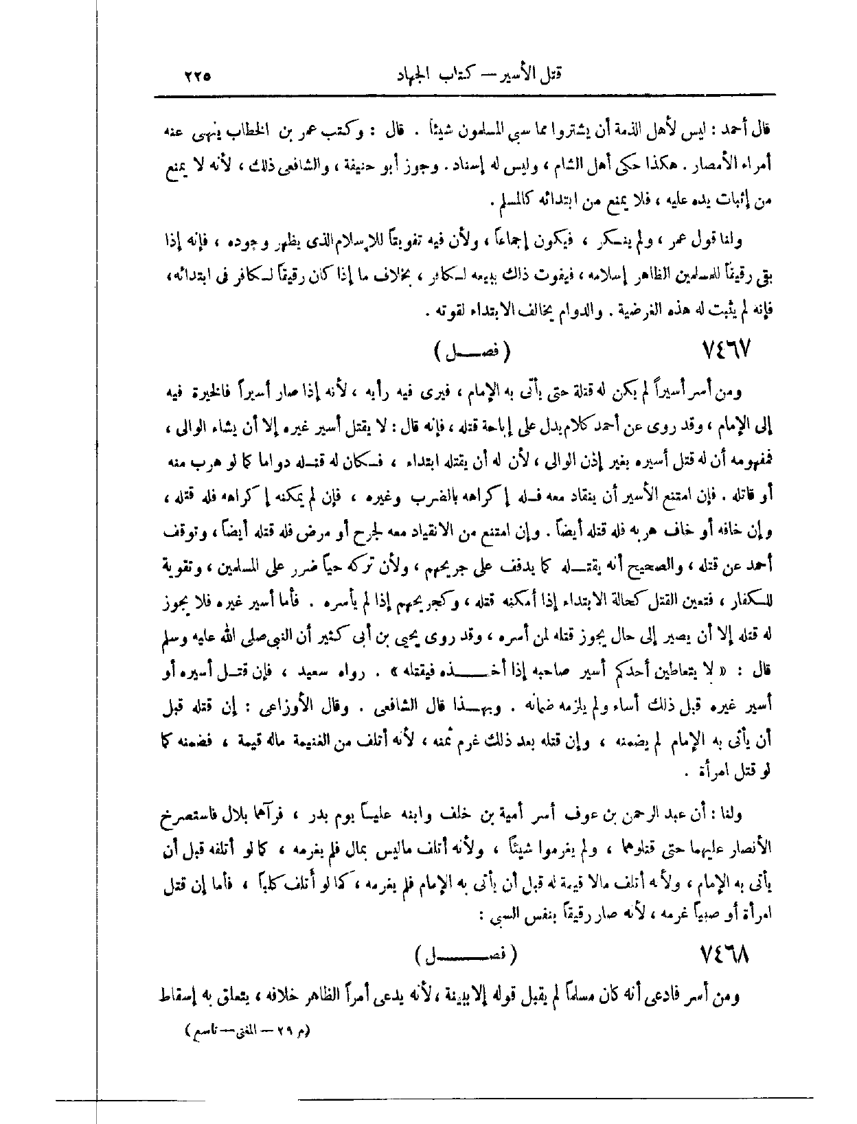 (٧٤٦٠) فَصْلٌ: وَمَنْ أَسَرَ أَسِيرًا، لَمْ يَكُنْ لَهُ قَتْلُهُ، حَتَّى يَأْتِيَ بِهِ الْإِمَامَ، فَيَرَى فِيهِ رَأْيَهُ؛ لِأَنَّهُ إذَا صَارَ أَسِيرًا، فَالْخِيرَةُ فِيهِ إلَى الْإِمَامِ، وَقَدْ رُوِيَ عَنْ أَحْمَدْ كَلَامٌ يَدُلُّ عَلَى إبَاحَةِ قَتْلِهِ، فَإِنَّهُ قَالَ: لَا يَقْتُلُ أَسِيرَ غَيْرِهِ إلَّا أَنْ يَشَاءَ الْوَالِي. فَمَفْهُومُهُ أَنَّ لَهُ قَتْلَ أَسِيرِهِ بِغَيْرِ إذْنِ الْوَالِي؛ لِأَنَّ لَهُ أَنْ يَقْتُلَهُ ابْتِدَاءً، فَكَانَ لَهُ قَتْلُهُ دَوَامًا، كَمَا لَوْ هَرَبَ مِنْهُ أَوْ قَاتَلَهُ. فَإِنْ امْتَنَعَ الْأَسِيرُ أَنْ يَنْقَادَ مَعَهُ، فَلَهُ إكْرَاهُهُ بِالضَّرْبِ وَغَيْرِهِ، فَإِنْ لَمْ يُمْكِنْهُ إكْرَاهُهُ، فَلَهُ قَتْلُهُ.