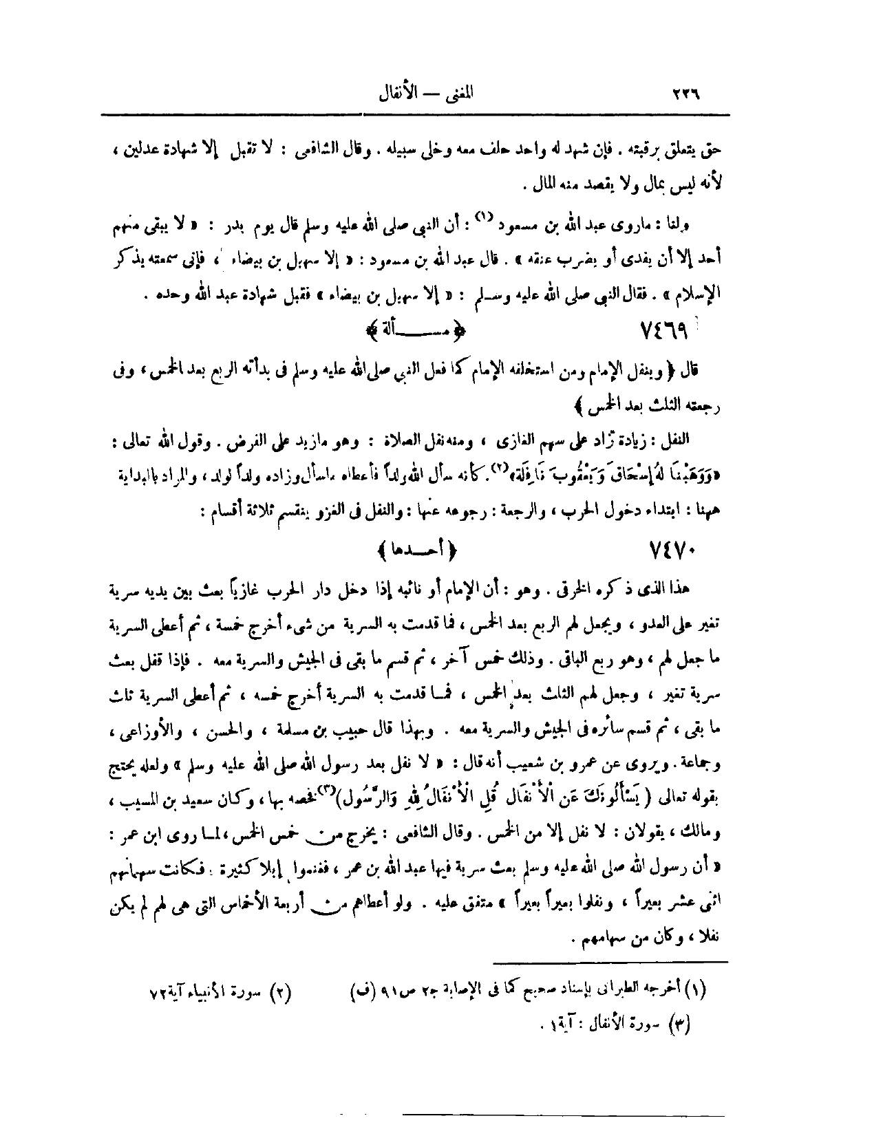(٧٤٦٢) مَسْأَلَةٌ: (وَيُنَفِّلُ الْإِمَامُ وَمَنْ اسْتَخْلَفَهُ الْإِمَامُ كَمَا فَعَلَ النَّبِيُّ - صَلَّى اللَّهُ عَلَيْهِ وَسَلَّمَ - فِي بَدَأَتْهُ الرُّبُعَ بَعْدَ الْخُمُسِ، وَفِي رَجْعَتِهِ الثُّلُثَ بَعْدَ الْخُمُسِ) النَّفَلُ زِيَادَةٌ تُزَادُ عَلَى سَهْمِ الْغَازِي، وَمِنْهُ نَفْلُ الصَّلَاةِ، وَهُوَ مَا زِيدَ عَلَى الْفَرْضِ، وَقَوْلُ اللَّهِ تَعَالَى: {وَوَهَبْنَا لَهُ إِسْحَاقَ وَيَعْقُوبَ نَافِلَةً} [الأنبياء: ٧٢] . كَأَنَّهُ سَأَلَ اللَّهَ وَلَدًا، فَأَعْطَاهُ مَا سَأَلَ وَزَادَهُ وَلَدَ الْوَلَدِ، وَالْمُرَادُ بِالْبِدَايَةِ هَا هُنَا، ابْتِدَاءُ دُخُولِ الْحَرْبِ، وَالرَّجْعَةِ رُجُوعُهُ عَنْهَا.