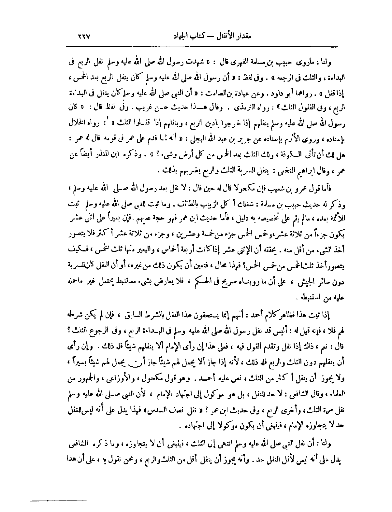 وَقَالَ الشَّافِعِيُّ: لَا حَدَّ لِلنَّفْلِ، بَلْ هُوَ مَوْكُولٌ إلَى اجْتِهَادِ الْإِمَامِ؛ لِأَنَّ النَّبِيَّ - صَلَّى اللَّهُ عَلَيْهِ وَسَلَّمَ - نَفَلَ مَرَّةً الثُّلُثَ، وَأُخْرَى الرُّبُعَ. وَفِي حَدِيثِ ابْنِ عُمَرَ: نَفَلَ نِصْفَ السُّدُسِ. فَهَذَا يَدُلَّ عَلَى أَنَّهُ لَيْسَ لِلنَّفْلِ حَدٌّ لَا يَتَجَاوَزُهُ الْإِمَامُ، فَيَنْبَغِي أَنْ يَكُونَ مَوْكُولًا إلَى اجْتِهَادِهِ. وَلَنَا، أَنَّ نَفْلَ النَّبِيِّ - صَلَّى اللَّهُ عَلَيْهِ وَسَلَّمَ - انْتَهَى إلَى الثُّلُثِ، فَيَنْبَغِي أَنْ لَا يَتَجَاوَزَهُ، وَمَا ذَكَرَهُ الشَّافِعِيُّ يَدُلُّ عَلَى أَنَّهُ لَيْسَ لِأَقَلِّ النَّفْلِ حَدٌّ، وَأَنَّهُ يَجُوزُ أَنْ يُنَفِّلَ أَقَلَّ مِنْ الثُّلُثِ وَالرُّبُعِ، وَنَحْنُ نَقُولُ بِهِ، عَلَى أَنَّ هَذَا