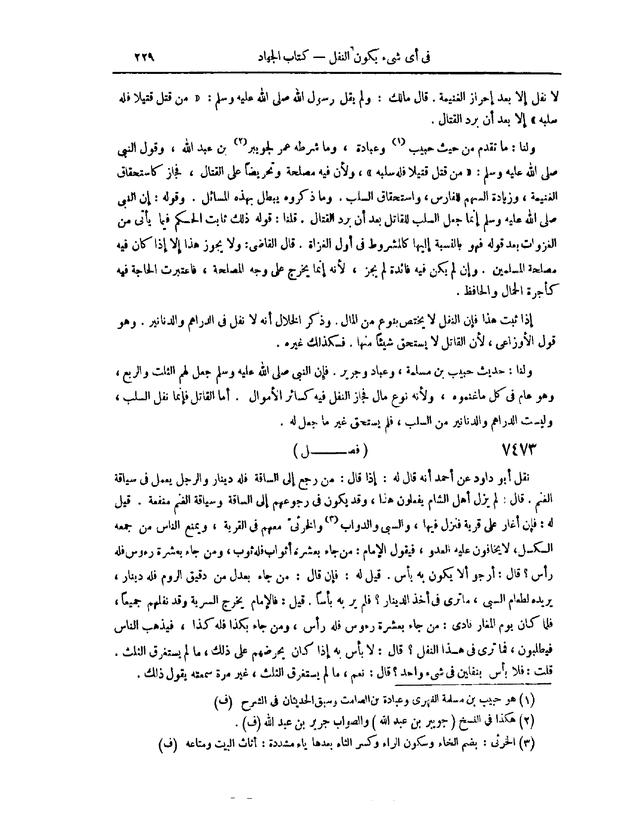 لَا نَفْلَ إلَّا بَعْدَ إحْرَازِ الْغَنِيمَةِ. قَالَ مَالِكٌ: وَلَمْ يَقُلْ رَسُولُ اللَّهِ - صَلَّى اللَّهُ عَلَيْهِ وَسَلَّمَ -: «مَنْ قَتَلَ قَتِيلًا فَلَهُ سَلَبُهُ» . إلَّا بَعْدَ أَنْ بَرَدَ الْقِتَالُ.