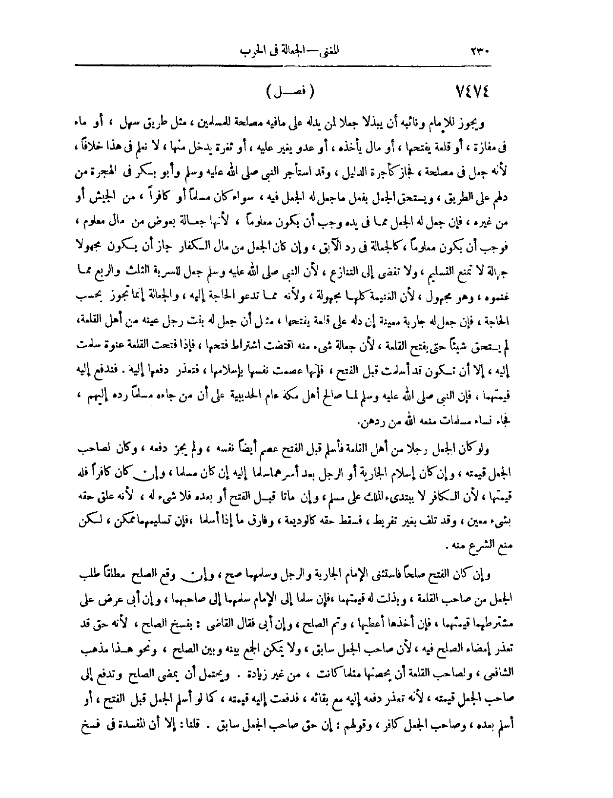 (٧٤٦٤) فَصْلٌ: وَيَجُوزُ لِلْإِمَامِ وَنَائِبِهِ أَنْ يَبْذُلَا جُعْلًا لِمَنْ يَدُلُّهُ عَلَى مَا فِيهِ مَصْلَحَةٌ لِلْمُسْلِمِينَ، مِثْلَ طَرِيقِ سَهْلٍ، أَوْ مَاءٍ فِي مَفَازَةٍ، أَوْ قَلْعَةٍ يَفْتَحُهَا، أَوْ مَالٍ يَأْخُذُهُ، أَوْ عَدُوٍّ يُغِيرُ عَلَيْهِ، أَوْ ثُغْرَةٍ يَدْخُلُ مِنْهَا. لَا نَعْلَمُ فِي هَذَا خِلَافًا؛ لِأَنَّهُ جَعَلَ فِي مَصْلَحَةٍ، فَجَازَ، كَأُجْرَةِ الدَّلِيلِ، وَقَدْ اسْتَأْجَرَ النَّبِيُّ - صَلَّى اللَّهُ عَلَيْهِ وَسَلَّمَ - وَأَبُو بَكْرٍ فِي الْهِجْرَةِ مَنْ دَلَّهُمْ عَلَى الطَّرِيقِ.