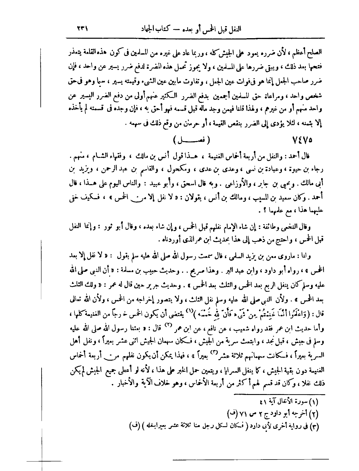 (٧٤٦٥) فَصْلٌ: قَالَ أَحْمَدُ: وَالنَّفَلُ مِنْ أَرْبَعَةِ أَخْمَاسِ الْغَنِيمَةِ. هَذَا قَوْلُ أَنَسِ بْنِ مَالِكٍ، وَفُقَهَاءِ الشَّامِ؛ مِنْهُمْ رَجَاءُ بْنُ حَيْوَةَ، وَعُبَادَةَ بْنُ نُسَيٍّ، وَعَدِيُّ بْنُ عَدِيٍّ، وَمَكْحُولٌ، وَالْقَاسِمُ بْنُ عَبْدِ الرَّحْمَنِ، وَيَزِيدُ بْنُ أَبِي مَالِكٍ، وَيَحْيَى بْنُ جَابِرٍ، وَالْأَوْزَاعِيُّ، وَبِهِ قَالَ إِسْحَاقُ، وَأَبُو عُبَيْدٍ.