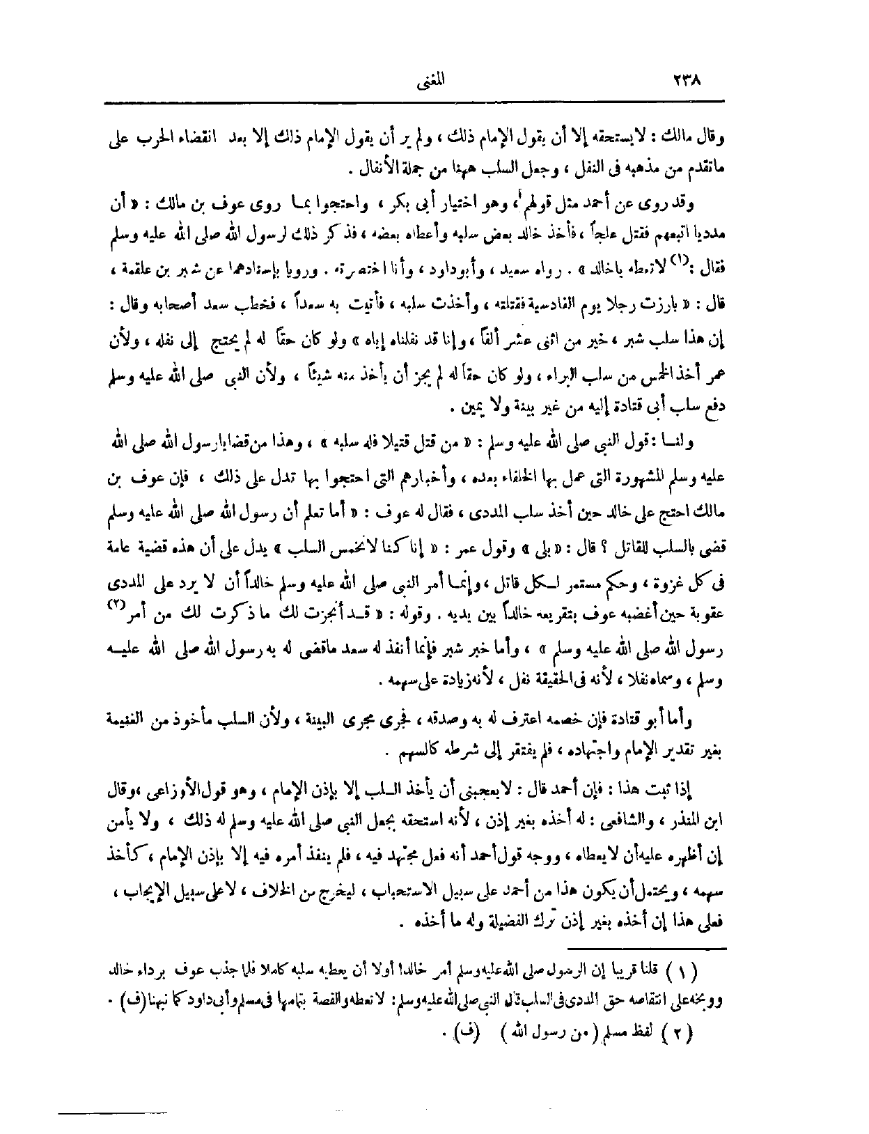 يَدُلُّ عَلَى أَنَّ هَذِهِ قَضِيَّةٌ عَامَّةٌ فِي كُلِّ غَزْوَةٍ، وَحُكْمٌ مُسْتَمِرٌّ لِكُلِّ قَاتِلٍ، وَإِنَّمَا أَمَرَ النَّبِيُّ - صَلَّى اللَّهُ عَلَيْهِ وَسَلَّمَ - خَالِدًا أَنْ لَا يَرُدَّ عَلَى الْمَدَدِيِّ عُقُوبَةً، حِينَ أَغْضَبَهُ عَوْفٌ بِتَقْرِيعِهِ خَالِدًا بَيْنَ يَدَيْهِ، وَقَوْلُهُ: قَدْ أَنْجَزْت لَك مَا ذَكَرْت لَك مِنْ أَمْرِ رَسُولِ اللَّهِ - صَلَّى اللَّهُ عَلَيْهِ وَسَلَّمَ -. وَأَمَّا خَبَرُ شِبْرٍ، فَإِنَّمَا أَنْفَذَ لَهُ سَعْدٌ مَا قَضَى لَهُ بِهِ رَسُولُ اللَّهِ - صَلَّى اللَّهُ عَلَيْهِ وَسَلَّمَ - وَسَمَّاهُ نَفْلًا، لِأَنَّهُ فِي الْحَقِيقَةِ نَفْلٌ؛ لِأَنَّهُ زِيَادَةٌ عَلَى سَهْمِهِ.