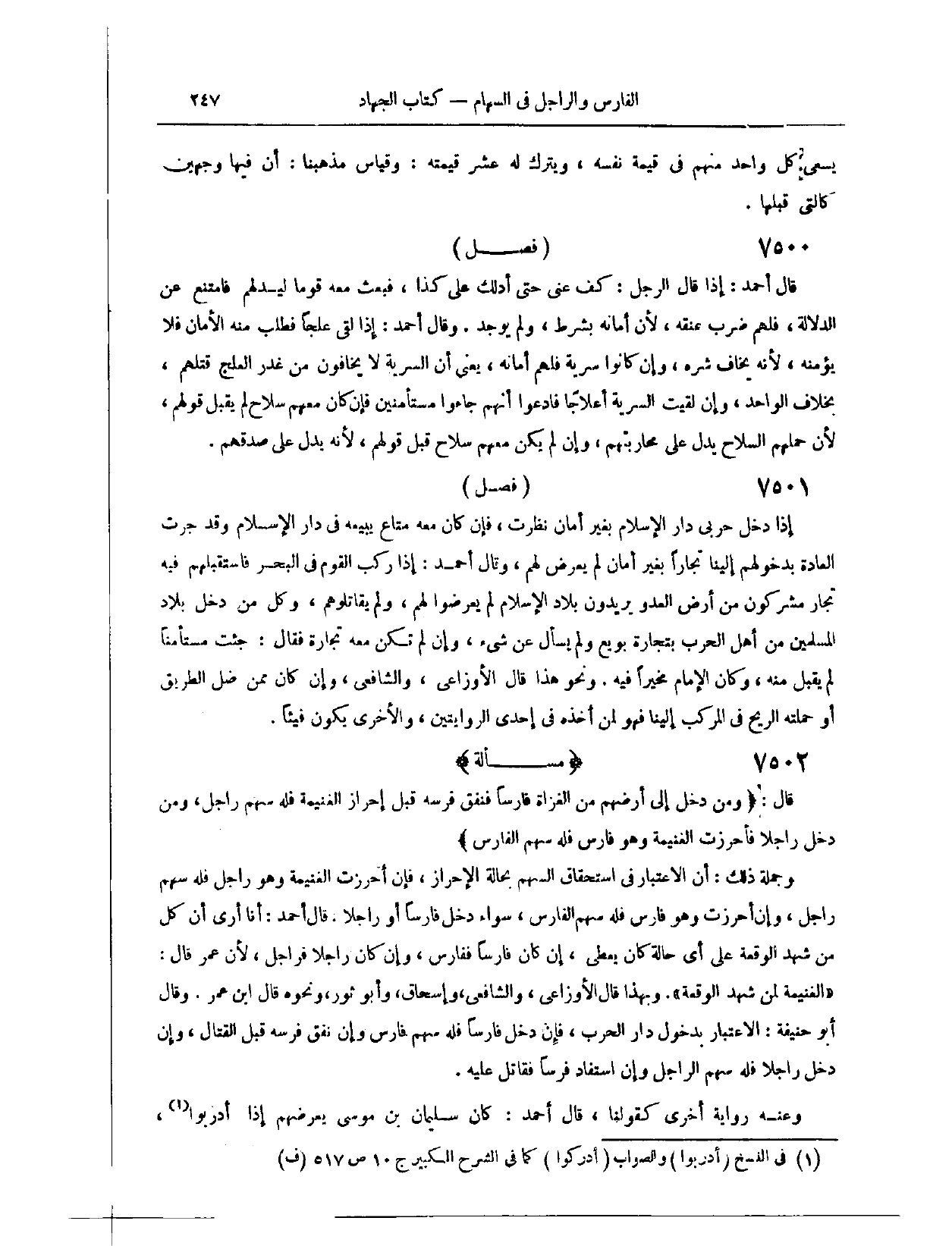 (٧٤٩٢) قَالَ: (وَمَنْ دَخَلَ إلَى أَرْضِهِمْ مِنْ الْغُزَاةِ فَارِسًا، فَنَفَقَ فَرَسُهُ قَبْلَ إحْرَازِ الْغَنِيمَةِ، فَلَهُ سَهْمُ رَاجِلٍ، وَمِنْ دَخَلَ رَاجِلًا، فَأُحْرِزَتْ الْغَنِيمَةُ وَهُوَ فَارِسٌ، فَلَهُ سَهْمُ الْفَارِسِ) وَجُمْلَةُ ذَلِكَ أَنَّ الِاعْتِبَارَ فِي اسْتِحْقَاقِ السَّهْمِ بِحَالَةِ الْإِحْرَازِ، فَإِنْ أُحْرِزَتْ الْغَنِيمَةُ وَهُوَ رَاجِلٌ، فَلَهُ سَهْمُ رَاجِلٍ، وَإِنْ أُحْرِزَتْ وَهُوَ فَارِسٌ، فَلَهُ سَهْمُ الْفَارِسِ، سَوَاءٌ دَخَلَ فَارِسًا أَوْ رَاجِلًا. قَالَ أَحْمَدُ: أَنَا أَرَى أَنَّ كُلَّ مَنْ شَهِدَ الْوَقْعَةَ عَلَى أَيِّ حَالَةٍ كَانَ يُعْطَى؛ إنْ كَانَ فَارِسًا فَفَارِسٌ، وَإِنْ كَانَ رَاجِلًا فَرَاجِلٌ؛ لِأَنَّ عُمَرَ قَالَ: الْغَنِيمَةُ لِمَنْ شَهِدَ الْوَقْعَةَ. وَبِهَذَا قَالَ الْأَوْزَاعِيُّ، وَالشَّافِعِيُّ، وَإِسْحَاقُ، وَأَبُو ثَوْرٍ.