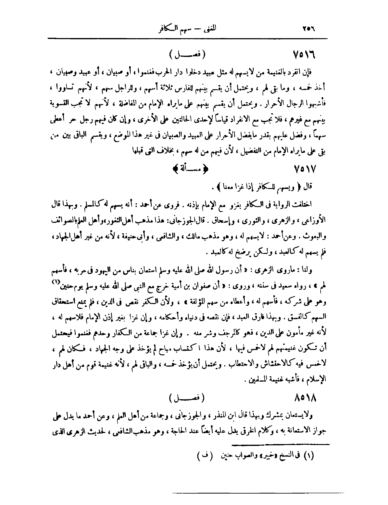 (٧٥٠٧) قَالَ: (وَيُسْهَمُ لِلْكَافِرِ، إذَا غَزَا مَعَنَا) اخْتَلَفَتْ الرِّوَايَةُ فِي الْكَافِرِ يَغْزُو مَعَ الْإِمَامِ بِإِذْنِهِ، فَرُوِيَ عَنْ أَحْمَدَ، أَنَّهُ يُسْهَمُ لَهُ كَالْمُسْلِمِ. وَبِهَذَا قَالَ الْأَوْزَاعِيُّ، وَالزُّهْرِيُّ، وَالثَّوْرِيُّ، وَإِسْحَاقُ، قَالَ الْجُوزَجَانِيُّ: هَذَا مَذْهَبُ أَهْلِ الثُّغُورِ، وَأَهْلِ الْعِلْمِ بِالصَّوَائِفِ وَالْبُعُوثِ. وَعَنْ أَحْمَدَ لَا يُسْهَمُ لَهُ.