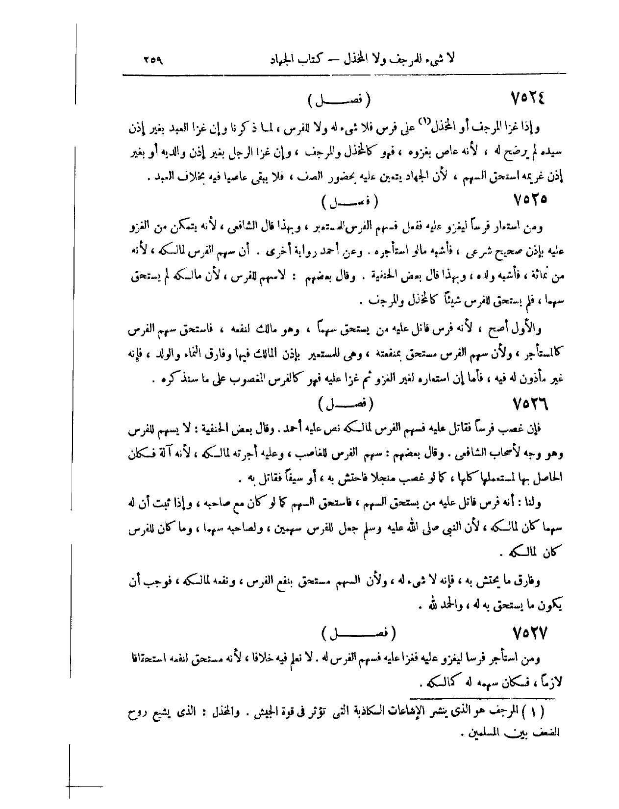 (٧٥١٤) وَإِذَا غَزَا الْمُرْجِفُ أَوْ الْمُخَذِّلُ عَلَى فَرَسٍ، فَلَا شَيْءَ لَهُ، وَلَا لِلْفَرَسِ؛ لِمَا ذَكَرْنَا، وَإِنْ غَزَا الْعَبْدُ بِغَيْرِ إذْنِ سَيِّدِهِ، لَمْ يُرْضَخْ لَهُ، لِأَنَّهُ عَاصٍ بِغَزْوِهِ، فَهُوَ كَالْمُخَذِّلِ وَالْمُرْجِفِ، وَإِنْ غَزَا الرَّجُلُ بِغَيْرِ إذْنِ وَالِدَيْهِ، أَوْ بِغَيْرِ إذْنِ غَرِيمِهِ، اسْتَحَقَّ السَّهْمَ؛ لِأَنَّ الْجِهَادَ يَتَعَيَّنُ عَلَيْهِ بِحُضُورِ الصَّفِّ، فَلَا يَبْقَى عَاصِيًا فِيهِ، بِخِلَافِ الْعَبْدِ.
