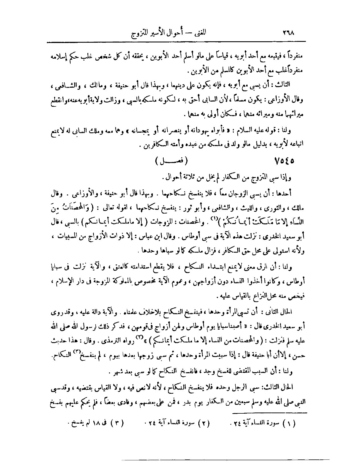 (٧٥٣٥) فَصْلٌ: وَإِذَا سُبِيَ الْمُتَزَوِّجُ مِنْ الْكُفَّارِ، لَمْ يَخْلُ مِنْ ثَلَاثَةِ أَحْوَالٍ؛ أَحَدُهَا، أَنْ يُسْبَى الزَّوْجَانِ مَعًا، فَلَا يَنْفَسِخُ نِكَاحُهُمَا. وَبِهَذَا قَالَ أَبُو حَنِيفَةَ، وَالْأَوْزَاعِيُّ. وَقَالَ مَالِكٌ، وَالثَّوْرِيُّ، وَاللَّيْثُ، وَالشَّافِعِيُّ، وَأَبُو ثَوْرٍ: يَنْفَسِخُ نِكَاحُهُمَا؛ لِقَوْلِهِ تَعَالَى: {وَالْمُحْصَنَاتُ مِنَ النِّسَاءِ إِلا مَا مَلَكَتْ أَيْمَانُكُمْ} [النساء: ٢٤] وَالْمُحْصَنَاتُ الْمُزَوَّجَاتُ {إِلا مَا مَلَكَتْ أَيْمَانُكُمْ} [النساء: ٢٤] بِالسَّبْيِ، قَالَ أَبُو سَعِيدٍ الْخُدْرِيِّ: نَزَلَتْ هَذِهِ الْآيَةُ فِي سَبْيِ أَوْطَاسٍ. وَقَالَ ابْنُ عَبَّاسٍ: إلَّا ذَوَاتِ الْأَزْوَاجِ مِنْ الْمَسْبِيَّاتِ.