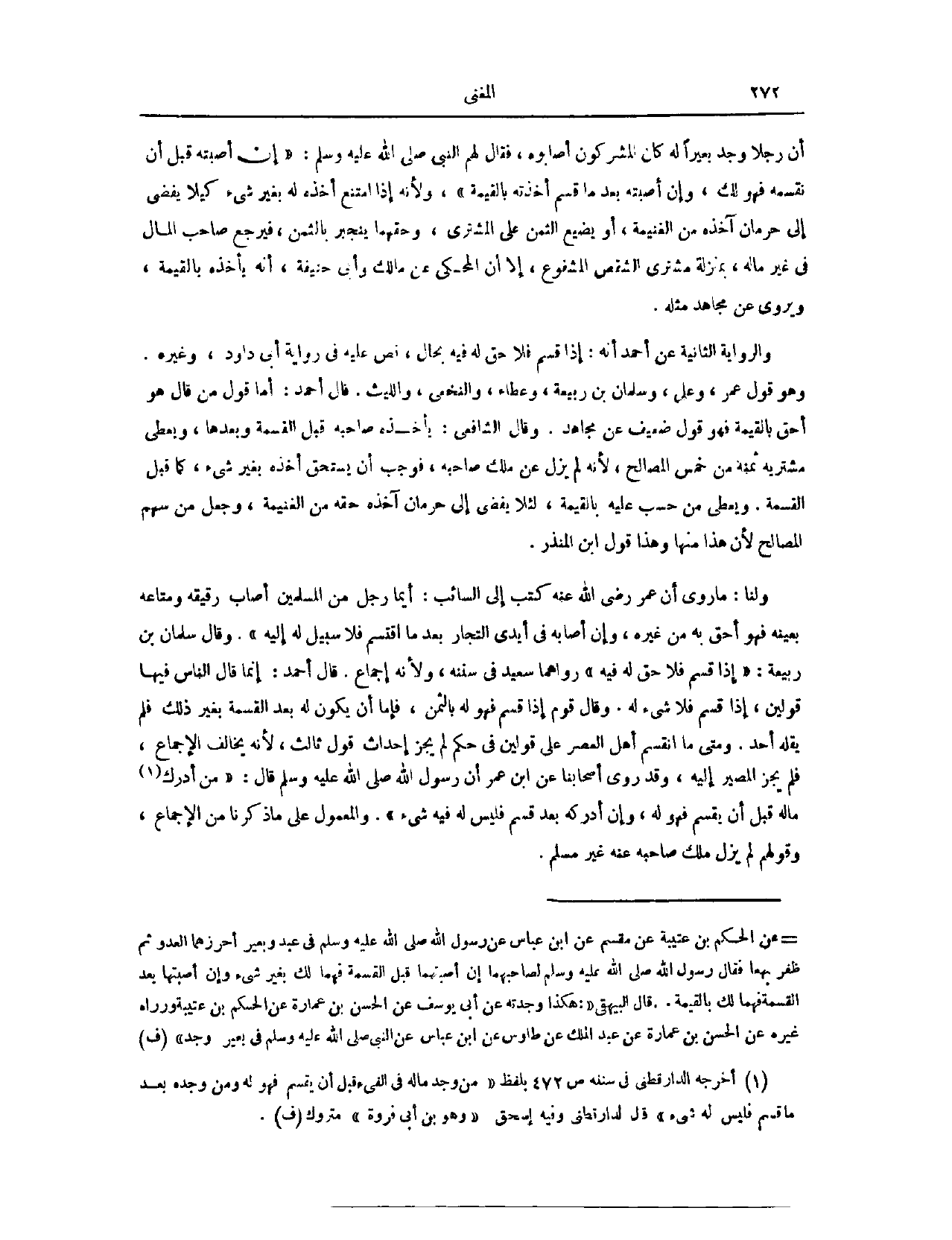 «مَنْ أَدْرَكَ مَالَهُ قَبْلَ أَنْ يُقْسَمَ، فَهُوَ لَهُ، وَإِنْ أَدْرَكَهُ بَعْدَ أَنْ قُسِمَ، فَلَيْسَ لَهُ فِيهِ شَيْءٌ.» وَالْمَعْمُولُ عَلَى مَا ذَكَرْنَا مِنْ الْإِجْمَاعِ، وَقَوْلُهُمْ: لَمْ يَزُلْ مِلْكُ صَاحِبِهِ عَنْهُ. غَيْرُ مُسَلَّمٍ.
