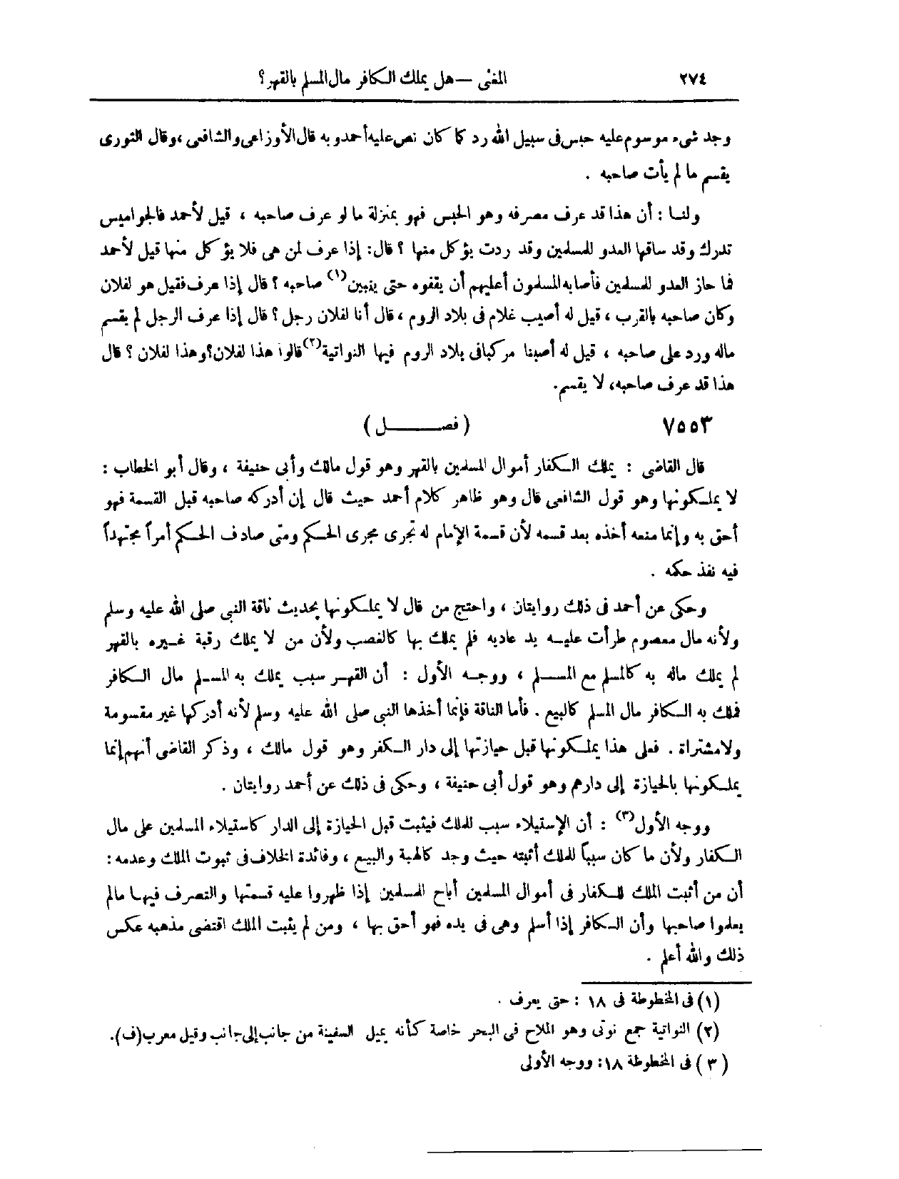 (٧٥٤٤) فَصْلٌ: قَالَ الْقَاضِي: يَمْلِكُ الْكُفَّارُ أَمْوَالَ الْمُسْلِمِينَ بِالْقَهْرِ. وَهُوَ قَوْلُ مَالِكٍ، وَأَبِي حَنِيفَةَ. وَقَالَ أَبُو الْخَطَّابِ: لَا يَمْلِكُونَهَا. وَهُوَ قَوْلُ الشَّافِعِيِّ. قَالَ: وَهُوَ ظَاهِرُ كَلَامِ أَحْمَدَ، حَيْثُ قَالَ: إنْ أَدْرَكَهُ صَاحِبُهُ قَبْلَ الْقِسْمَةِ؛ فَهُوَ أَحَقُّ بِهِ. وَإِنَّمَا مَنَعَهُ أَخْذَهُ بَعْدَ قَسْمِهِ، لِأَنَّ قِسْمَةَ الْإِمَامِ لَهُ تَجْرِي مَجْرَى الْحُكْمِ، وَمَتَى صَادَفَ الْحُكْمُ أَمْرًا مُجْتَهَدًا فِيهِ، نَفَذَ حُكْمُهُ.