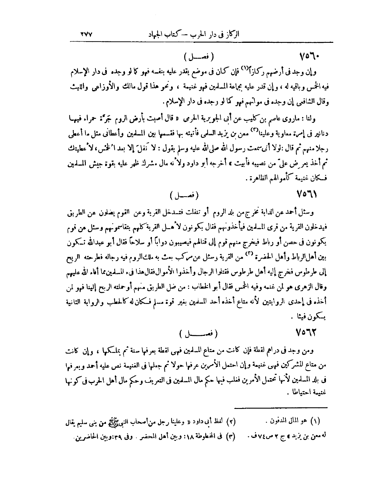 (٧٥٥٢) فَصْلٌ: وَسُئِلَ أَحْمَدُ، عَنْ الدَّابَّةِ تَخْرُجُ مِنْ بَلَدِ الرُّومِ، أَوْ تَنْفَلِتُ، فَتَدْخُلُ الْقَرْيَةَ، وَعَنْ الْقَوْمِ يَضِلُّونَ عَنْ الطَّرِيقِ، فَيَدْخُلُونَ الْقَرْيَةَ مِنْ قُرَى الْمُسْلِمِينَ، فَيَأْخُذُونَهُمْ؟ فَقَالَ يَكُونُونَ لِأَهْلِ الْقَرْيَةِ كُلِّهِمْ، يَتَقَاسَمُونَهُمْ. وَسُئِلَ عَنْ قَوْمٍ يَكُونُونَ فِي حِصْنٍ أَوْ رِبَاطٍ، فَيَخْرُجُ مِنْهُمْ قَوْمٌ إلَى قِتَالِهِمْ، فَيُصِيبُونَ دَوَابَّ أَوْ سِلَاحًا؟ فَقَالَ أَبُو عَبْدِ اللَّهِ: تَكُونُ بَيْنَ أَهْلِ الرِّبَاطِ وَأَهْلِ الْحَضْرَةِ مِنْ الْقَرْيَةِ.