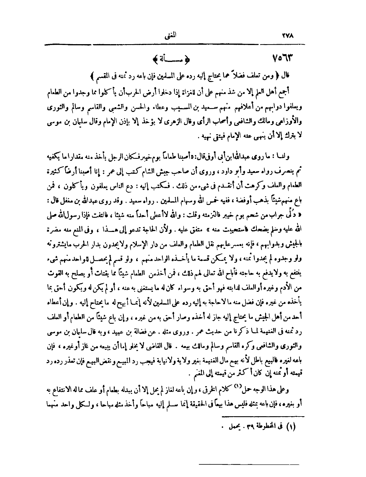 (٧٥٥٤) مَسْأَلَةٌ؛ قَالَ: (وَمَنْ تَعَلَّفَ فَضْلًا عَمَّا يَحْتَاجُ إلَيْهِ، رَدَّهُ عَلَى الْمُسْلِمِينَ، فَإِنْ بَاعَهُ، رَدَّ ثَمَنَهُ فِي الْمُقْسِم) أَجْمَعَ أَهْلُ الْعِلْمِ، إلَّا مَنْ شَذَّ مِنْهُمْ، عَلَى أَنَّ لِلْغُزَاةِ إذَا دَخَلُوا أَرْضَ الْحَرْبِ، أَنْ يَأْكُلُوا مِمَّا وَجَدُوا مِنْ الطَّعَامِ، وَيَعْلِفُوا دَوَابَّهُمْ مِنْ أَعْلَافِهِمْ؛ مِنْهُمْ سَعِيدُ بْنُ الْمُسَيِّبِ، وَعَطَاءٌ، وَالْحَسَنُ، وَالشَّعْبِيُّ، وَالْقَاسِمُ، وَسَالِمٌ، وَالثَّوْرِيُّ، وَالْأَوْزَاعِيُّ، وَمَالِكٌ، وَالشَّافِعِيُّ، وَأَصْحَابُ الرَّأْيِ. وَقَالَ الزُّهْرِيُّ: لَا يُؤْخَذُ إلَّا بِإِذْنِ الْإِمَامِ.
