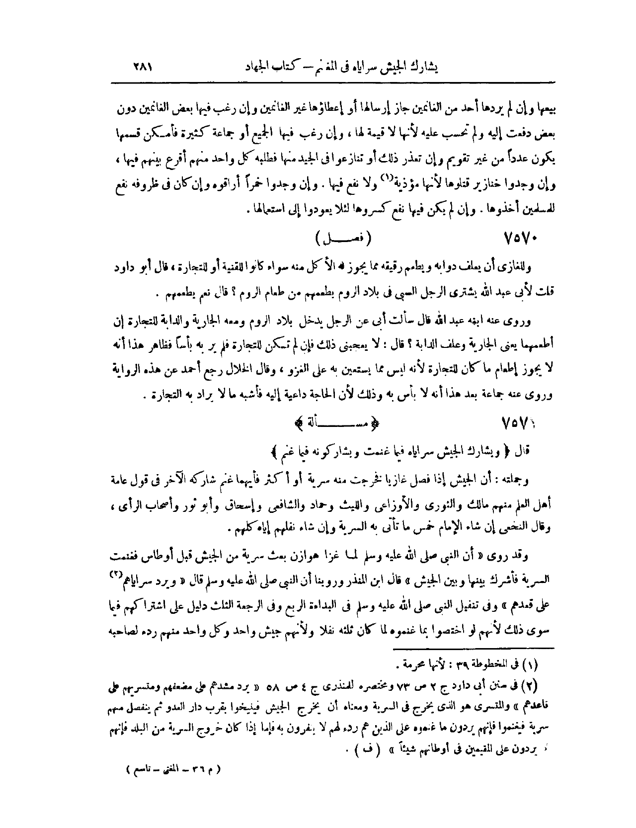 (٧٥٦١) فَصْلٌ: وَلِلْغَازِي أَنْ يَعْلِفَ دَوَابَّهُ، وَيُطْعِمَ رَقِيقَهُ، مِمَّا يَجُوزُ لَهُ الْأَكْلُ مِنْهُ، سَوَاءٌ كَانُوا لِلْقُنْيَةِ أَوْ لِلتِّجَارَةِ. قَالَ أَبُو دَاوُد: قُلْت لِأَبِي عَبْدِ اللَّهِ: يَشْتَرِي الرَّجُلُ السَّبْيَ فِي بِلَادِ الرُّومِ، يُطْعِمُهُمْ مِنْ طَعَامِ الرُّومِ؟ قَالَ: نَعَمْ، يُطْعِمُهُمْ. وَرَوَى عَنْهُ ابْنُهُ عَبْدُ اللَّهِ، قَالَ: سَأَلْت أَبِي عَنْ الرَّجُلِ يَدْخُلُ بِلَادَ الرُّومِ، وَمَعَهُ الْجَارِيَةُ وَالدَّابَّةُ لِلتِّجَارَةِ، إنْ أَطْعَمَهُمَا يَعْنِي الْجَارِيَةَ وَعَلَفَ الدَّابَّةِ؟ قَالَ: لَا يُعْجِبُنِي ذَلِكَ.