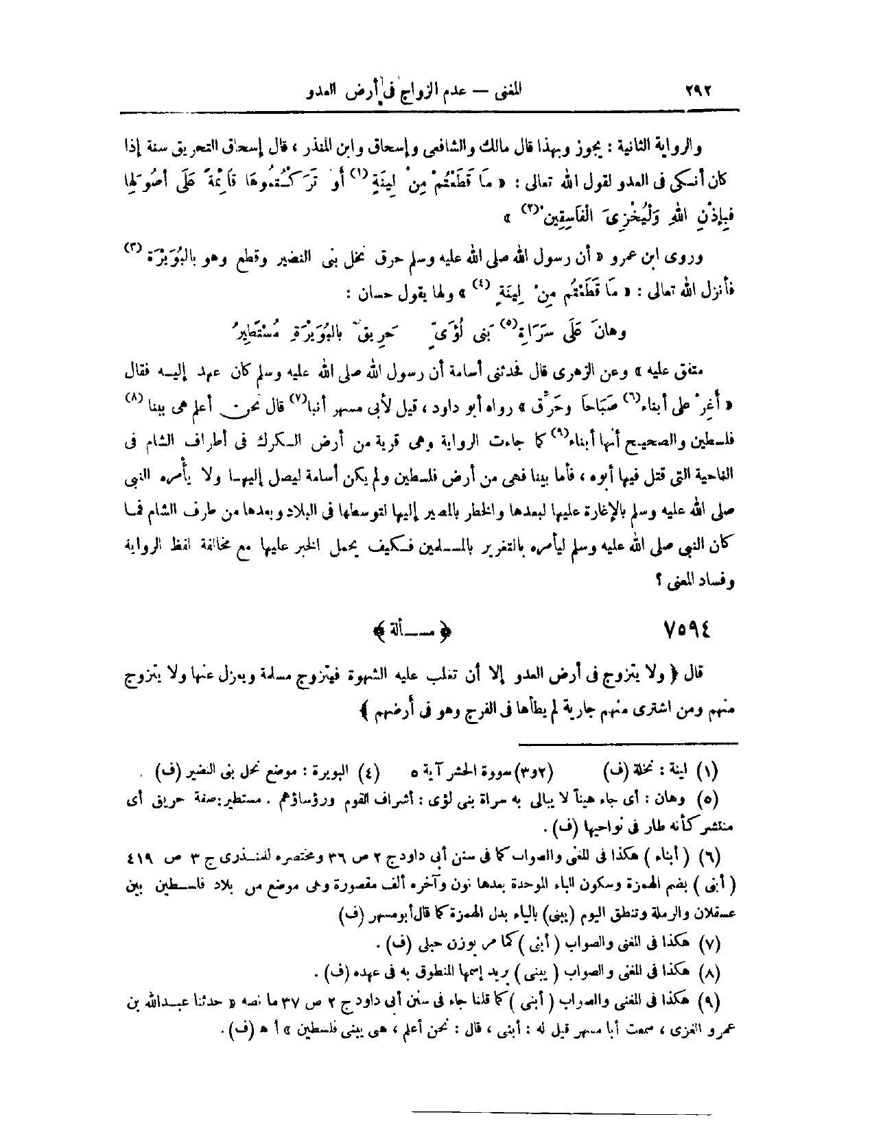 وَرَوَى ابْنُ عُمَرَ، «أَنَّ رَسُولَ اللَّهِ - صَلَّى اللَّهُ عَلَيْهِ وَسَلَّمَ - حَرَّقَ نَخْلَ بَنِي النَّضِيرِ، وَقَطَعَ، وَهُوَ الْبُوَيْرَةُ» فَأَنْزَلَ اللَّهُ تَعَالَى: {مَا قَطَعْتُمْ مِنْ لِينَةٍ} [الحشر: ٥] . وَلَهَا يَقُولُ حَسَّانُ:
