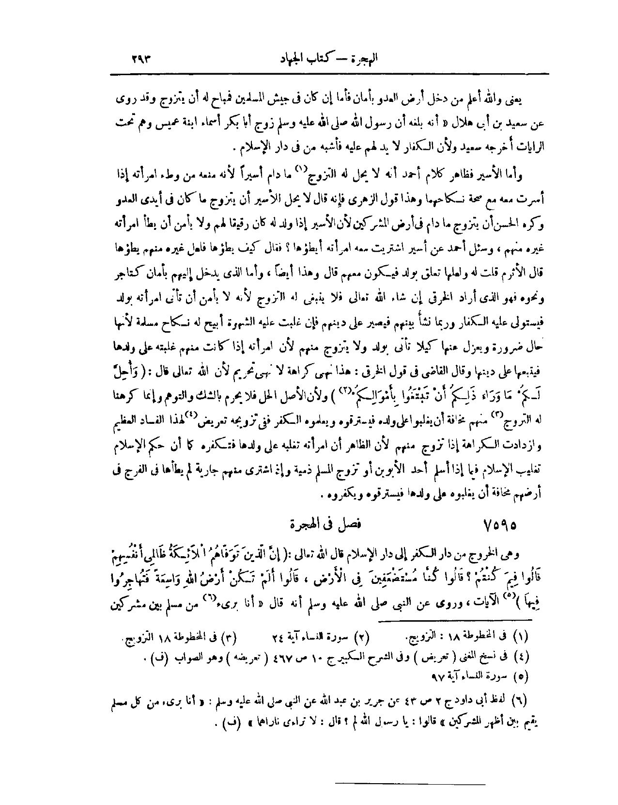 ِ: وَهِيَ الْخُرُوجُ مِنْ دَارِ الْكُفْرِ إلَى دَارِ الْإِسْلَامِ. قَالَ اللَّهُ تَعَالَى: {إِنَّ الَّذِينَ تَوَفَّاهُمُ الْمَلائِكَةُ ظَالِمِي أَنْفُسِهِمْ قَالُوا فِيمَ كُنْتُمْ قَالُوا كُنَّا مُسْتَضْعَفِينَ فِي الأَرْضِ قَالُوا أَلَمْ تَكُنْ أَرْضُ اللَّهِ وَاسِعَةً فَتُهَاجِرُوا فِيهَا} [النساء: ٩٧] . الْآيَاتِ. وَرُوِيَ عَنْ النَّبِيِّ - صَلَّى اللَّهُ عَلَيْهِ وَسَلَّمَ - أَنَّهُ قَالَ: «أَنَا بَرِيءٌ مِنْ مُسْلِمٍ بَيْنَ مُشْرِكَيْنِ،