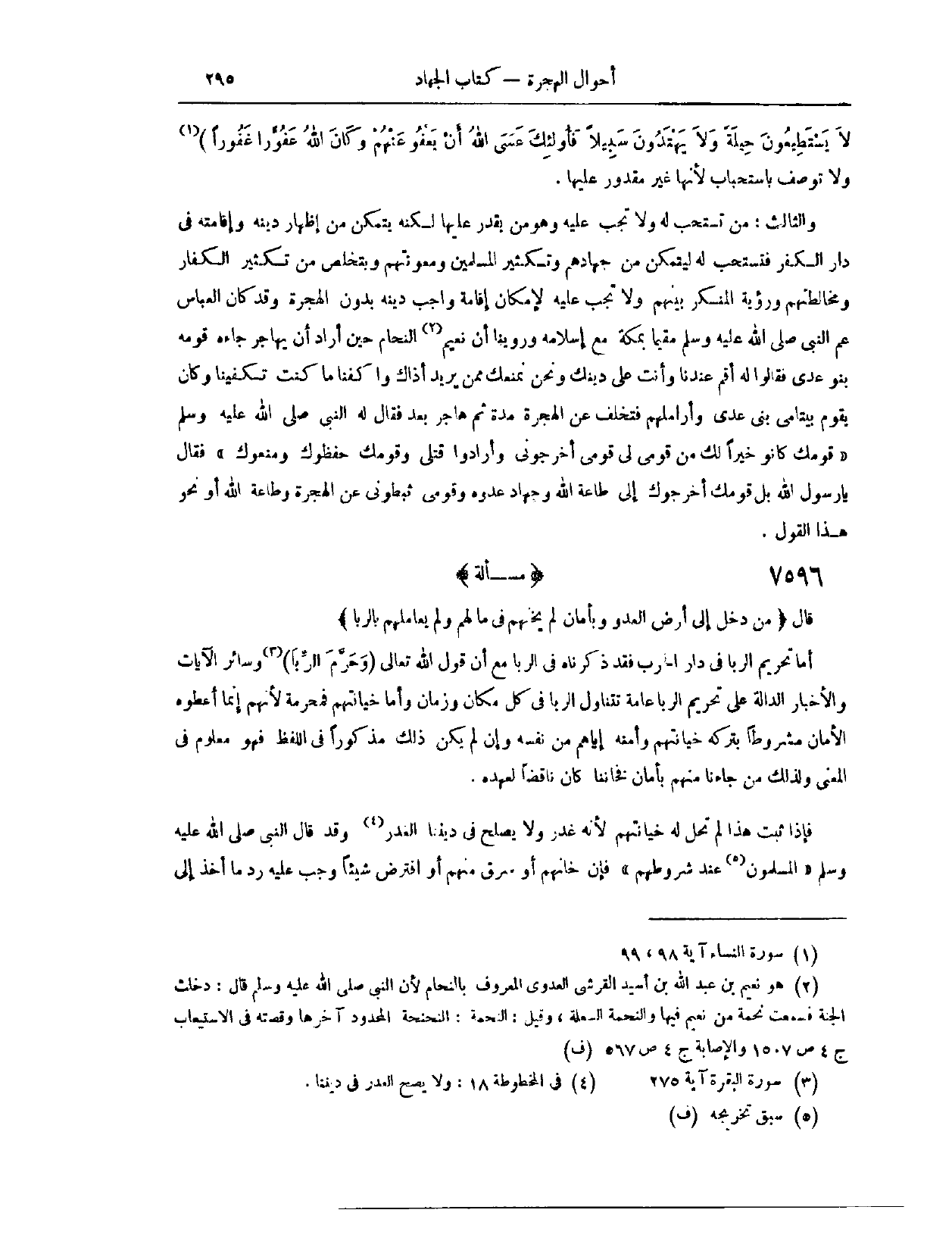 وَرَوَيْنَا «أَنَّ نُعَيْمَ النَّحَّامَ، حِينَ أَرَادَ أَنْ يُهَاجِرَ، جَاءَهُ قَوْمُهُ بَنُو عَدِيٍّ، فَقَالُوا لَهُ: أَقِمْ عِنْدَنَا، وَأَنْتَ عَلَى دِينِك، وَنَحْنُ نَمْنَعُك مِمَّنْ يُرِيدُ أَذَاك، وَاكْفِنَا مَا كُنْت تَكْفِينَا. وَكَانَ يَقُومُ بِيَتَامَى بَنِي عَدِيٍّ وَأَرَامِلِهِمْ، فَتَخَلَّفَ عَنْ الْهِجْرَةِ مُدَّةً، ثُمَّ هَاجَرَ بَعْدُ، فَقَالَ لَهُ النَّبِيُّ - صَلَّى اللَّهُ عَلَيْهِ وَسَلَّمَ -: قَوْمُك كَانُوا خَيْرًا لَك مِنْ قَوْمِي لِي، قَوْمِي أَخْرَجُونِي، وَأَرَادُوا قَتْلِي، وَقَوْمُك حَفِظُوك وَمَنَعُوك. فَقَالَ: يَا رَسُولَ اللَّهِ: بَلْ قَوْمُك أَخْرَجُوك إلَى طَاعَةِ اللَّهِ، وَجِهَادِ عَدُوِّهِ وَقَوْمِي ثَبَّطُونِي عَنْ الْهِجْرَةِ، وَطَاعَةِ اللَّهِ أَوْ نَحْوَ هَذَا الْقَوْلِ» .