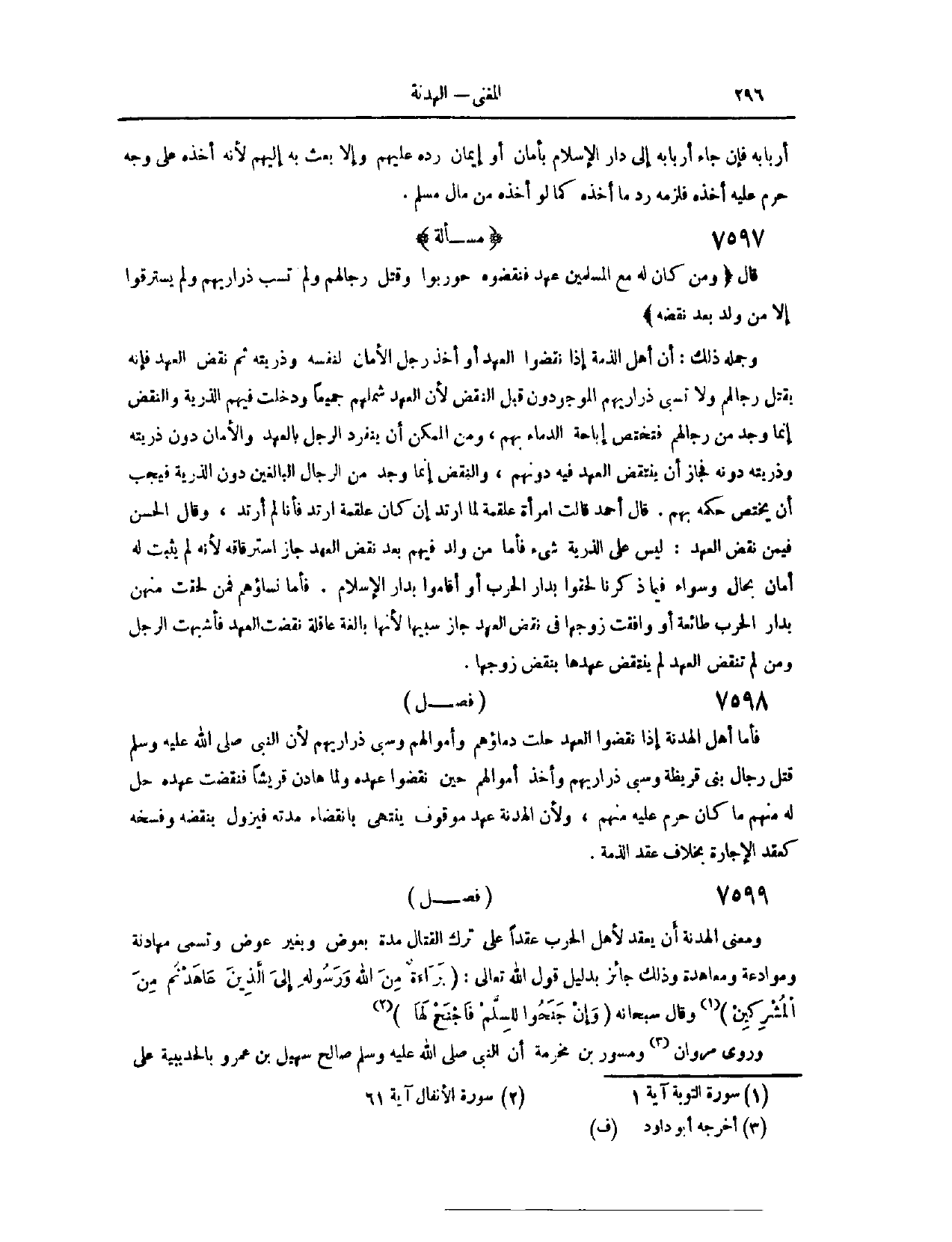 (٧٥٩٠) فَصْلٌ: وَمَعْنَى الْهُدْنَةِ، أَنْ يَعْقِدَ لِأَهْلِ الْحَرْبِ عَقْدًا عَلَى تَرْكِ الْقِتَالِ مُدَّةً، بِعِوَضٍ وَبِغَيْرِ عِوَضٍ. وَتُسَمَّى مُهَادَنَةً وَمُوَادَعَةً وَمُعَاهَدَةً، وَذَلِكَ جَائِزٌ، بِدَلِيلِ قَوْلِ اللَّهِ تَعَالَى: {بَرَاءَةٌ مِنَ اللَّهِ وَرَسُولِهِ إِلَى الَّذِينَ عَاهَدْتُمْ مِنَ الْمُشْرِكِينَ} [التوبة: ١] . وَقَالَ سُبْحَانَهُ وَتَعَالَى: {وَإِنْ جَنَحُوا لِلسَّلْمِ فَاجْنَحْ لَهَا} [الأنفال: ٦١] .