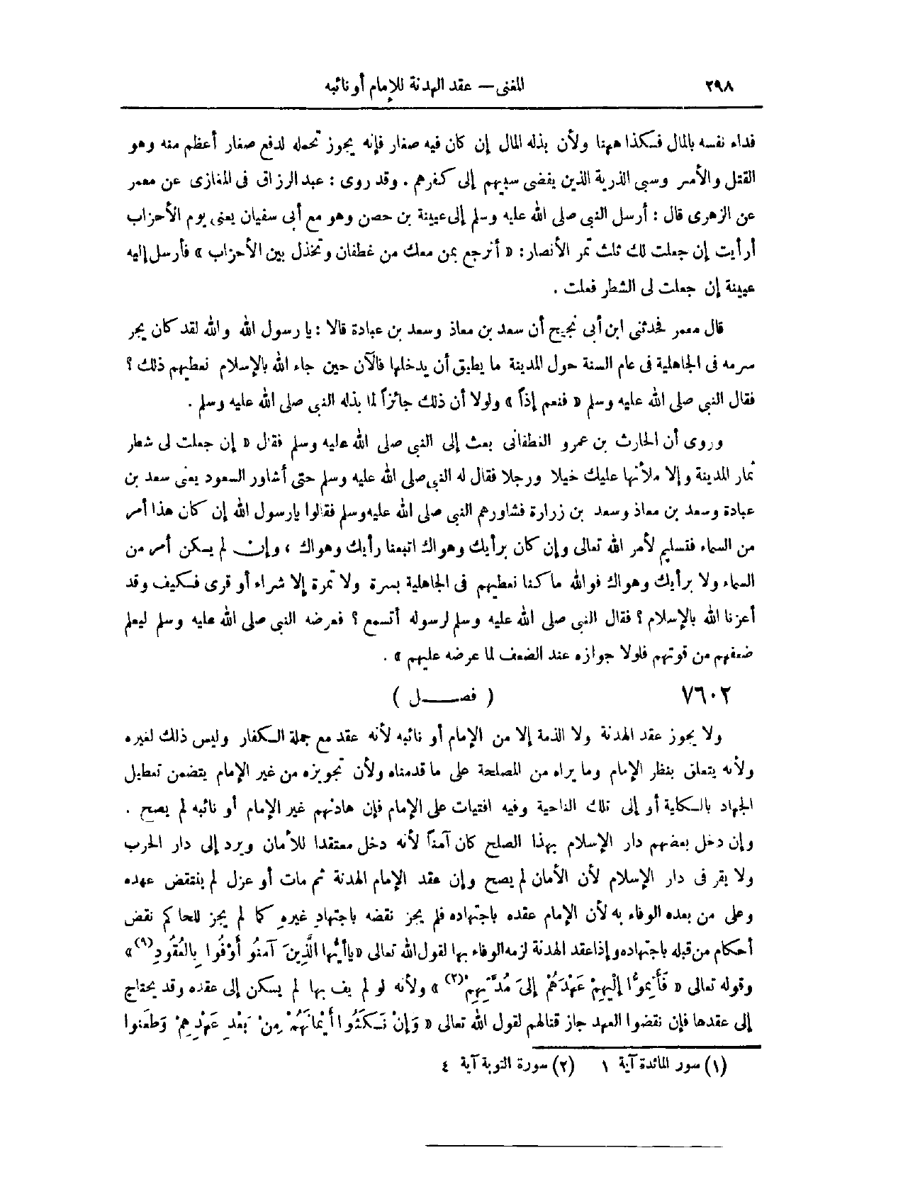 (٧٥٩٣) فَصْلٌ: وَلَا يَجُوزُ عَقْدُ الْهُدْنَةِ وَلَا الذِّمَّةِ إلَّا مِنْ الْإِمَامِ أَوْ نَائِبِهِ؛ لِأَنَّهُ عَقْدٌ مَعَ جُمْلَةِ الْكُفَّارِ، وَلَيْسَ ذَلِكَ لِغَيْرِهِ، وَلِأَنَّهُ يَتَعَلَّقُ بِنَظَرِ الْإِمَامِ وَمَا يَرَاهُ مِنْ الْمَصْلَحَةِ، عَلَى مَا قَدَّمْنَاهُ وَلِأَنَّ تَجْوِيزَهُ مِنْ غَيْرِ الْإِمَامِ يَتَضَمَّنُ تَعْطِيلَ الْجِهَادِ بِالْكُلِّيَّةِ، أَوْ إلَى تِلْكَ النَّاحِيَةِ، وَفِيهِ افْتِيَاتٌ عَلَى الْإِمَامِ.