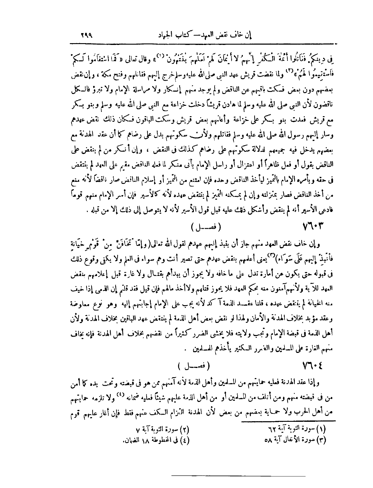 وَلَا يَجُوزُ أَنْ يَبْدَأَهُمْ بِقِتَالٍ وَلَا غَارَةٍ قَبْلَ إعْلَامِهِمْ بِنَقْضِ الْعَهْدِ؛ لِلْآيَةِ، وَلِأَنَّهُمْ آمِنُونَ مِنْهُ بِحُكْمِ الْعَهْدِ، فَلَا يَجُوزُ قَتْلُهُمْ، وَلَا أَخْذُ مَالِهِمْ. فَإِنْ قِيلَ: فَقَدْ قُلْتُمْ: إنَّ الذِّمِّيَّ إذَا خِيفَ مِنْهُ الْخِيَانَةُ، لَمْ يَنْتَقِضْ عَهْدُهُ. قُلْنَا: عَقْدُ الذِّمَّةِ آكَدُ؛ لِأَنَّهُ يَجِبُ عَلَى الْإِمَامِ إجَابَتُهُمْ إلَيْهِ، وَهُوَ نَوْعُ مُعَاوَضَةٍ، وَعَقْدٌ مُؤَبَّدٌ، بِخِلَافِ الْهُدْنَةِ وَالْأَمَانِ، وَلِهَذَا لَوْ نَقَضَ بَعْضُ أَهْلِ الذِّمَّةِ، لَمْ يَنْتَقِضْ عَهْدُ الْبَاقِينَ، بِخِلَافِ الْهُدْنَةِ، وَلِأَنَّ أَهْلَ الذِّمَّةِ فِي قَبْضَةِ الْإِمَامِ، وَتَجِبُ وِلَايَتُهُ، وَلَا يُخْشَى الضَّرَرُ كَثِيرًا مِنْ نَقْضِهِمْ، بِخِلَافِ أَهْلِ الْهُدْنَةِ، فَإِنَّهُ يُخَافُ مِنْهُمْ الْغَارَةُ عَلَى الْمُسْلِمِينَ، وَالضَّرَرُ الْكَثِيرُ بِأَخْذِهِمْ لِلْمُسْلِمِينَ.