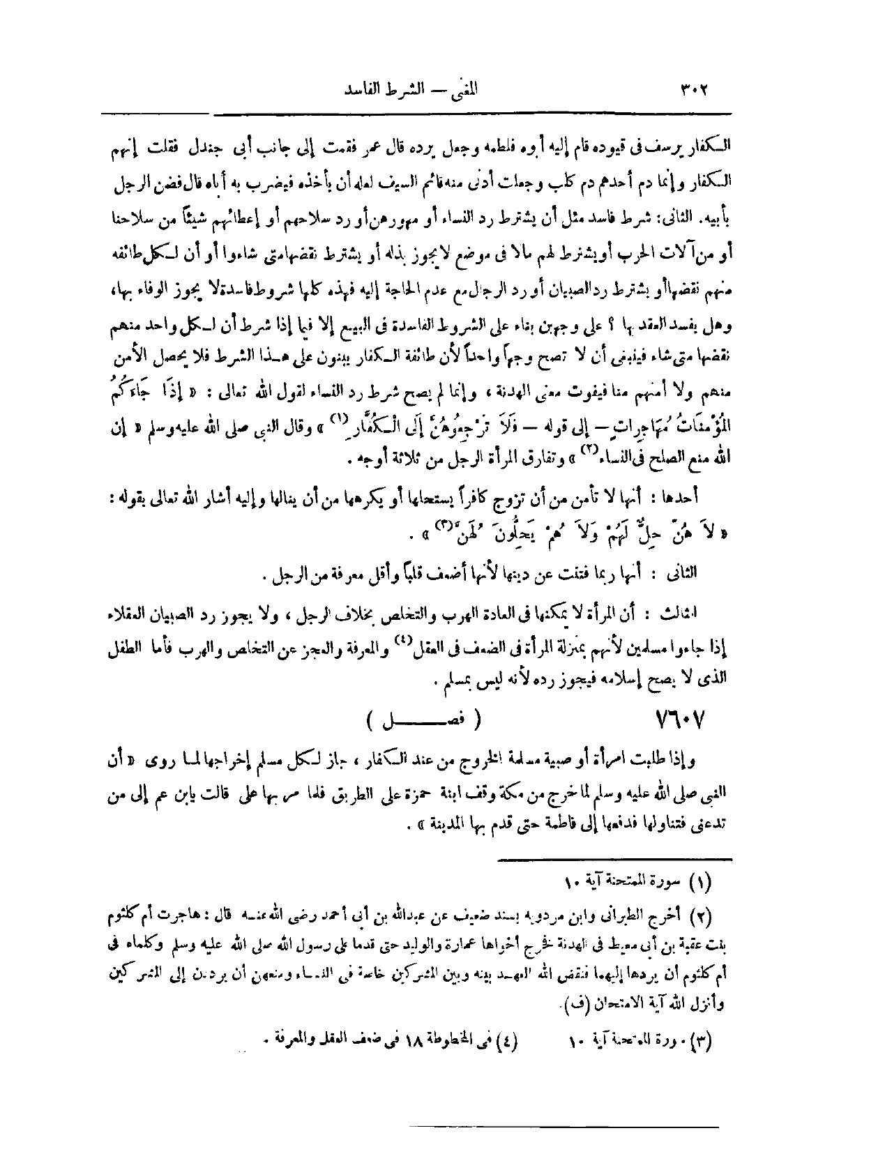 فَهَذِهِ كُلُّهَا شُرُوطٌ فَاسِدَةٌ، لَا يَجُوزُ الْوَفَاءُ بِهَا. وَهَلْ يَفْسُدُ الْعَقْدُ بِهَا؟ عَلَى وَجْهَيْنِ، بِنَاءً عَلَى الشُّرُوطِ الْفَاسِدَةِ فِي الْبَيْعِ، إلَّا فِيمَا إذَا شَرَطَ أَنَّ لِكُلِّ وَاحِدٍ مِنْهُمْ نَقْضَهَا مَتَى شَاءَ، فَيَنْبَغِي أَنْ لَا تَصِحَّ وَجْهًا وَاحِدًا، لِأَنَّ طَائِفَةَ الْكُفَّارِ يَبْنُونَ عَلَى هَذَا الشَّرْطِ، فَلَا يَحْصُلُ الْأَمْنُ مِنْهُمْ، وَلَا أَمْنُهُمْ مِنَّا، فَيَفُوتُ مَعْنَى الْهُدْنَةِ. وَإِنَّمَا لَمْ يَصِحَّ شَرْطُ رَدِّ النِّسَاءِ؛ لِقَوْلِ اللَّهِ تَعَالَى: {إِذَا جَاءَكُمُ الْمُؤْمِنَاتُ مُهَاجِرَاتٍ} [الممتحنة: ١٠] إلَى قَوْلِهِ: {فَلا تَرْجِعُوهُنَّ إِلَى الْكُفَّارِ} [الممتحنة: ١٠] . وَقَالَ النَّبِيُّ - صَلَّى اللَّهُ عَلَيْهِ وَسَلَّمَ -: «إنَّ اللَّهَ مَنَعَ الصُّلْحَ فِي النِّسَاءِ» .