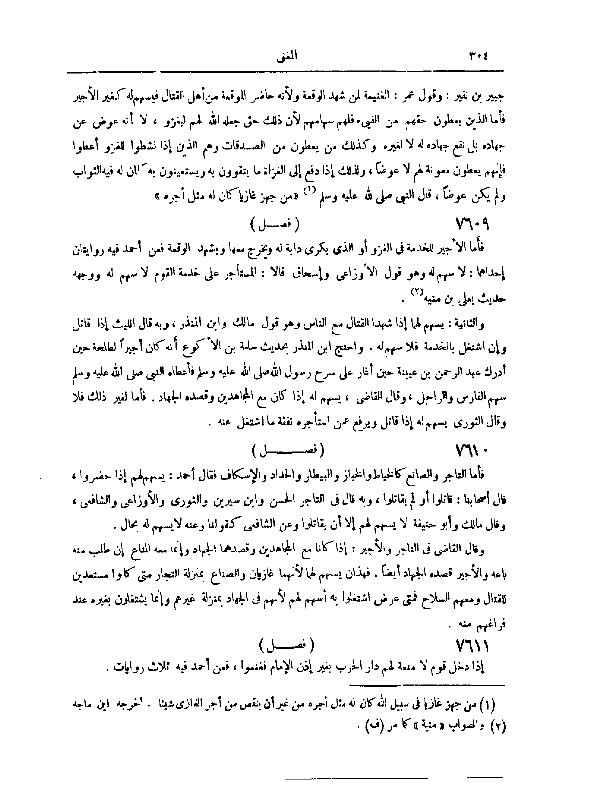 (٧٦٠١) فَصْلٌ: فَأَمَّا التَّاجِرُ وَالصَّانِعُ، كَالْخَيَّاطِ وَالْخَبَّازِ وَالْبَيْطَارِ وَالْحَدَّادِ وَالْإِسْكَافِ، فَقَالَ أَحْمَدُ: يُسْهَمُ لَهُمْ إذَا حَضَرُوا. قَالَ أَصْحَابُنَا: قَاتَلُوا أَوْ لَمْ يُقَاتِلُوا. وَبِهِ قَالَ فِي التَّاجِرِ الْحَسَنُ، وَابْنُ سِيرِينَ، وَالثَّوْرِيُّ، وَالْأَوْزَاعِيُّ، وَالشَّافِعِيُّ. وَقَالَ وَمَالِكٌ، وَأَبُو حَنِيفَةَ: لَا يُسْهَمُ لَهُمْ، إلَّا أَنْ يُقَاتِلُوا. وَعَنْ الشَّافِعِيِّ كَقَوْلِنَا. وَعَنْهُ لَا يُسْهَمُ لَهُ بِحَالٍ.