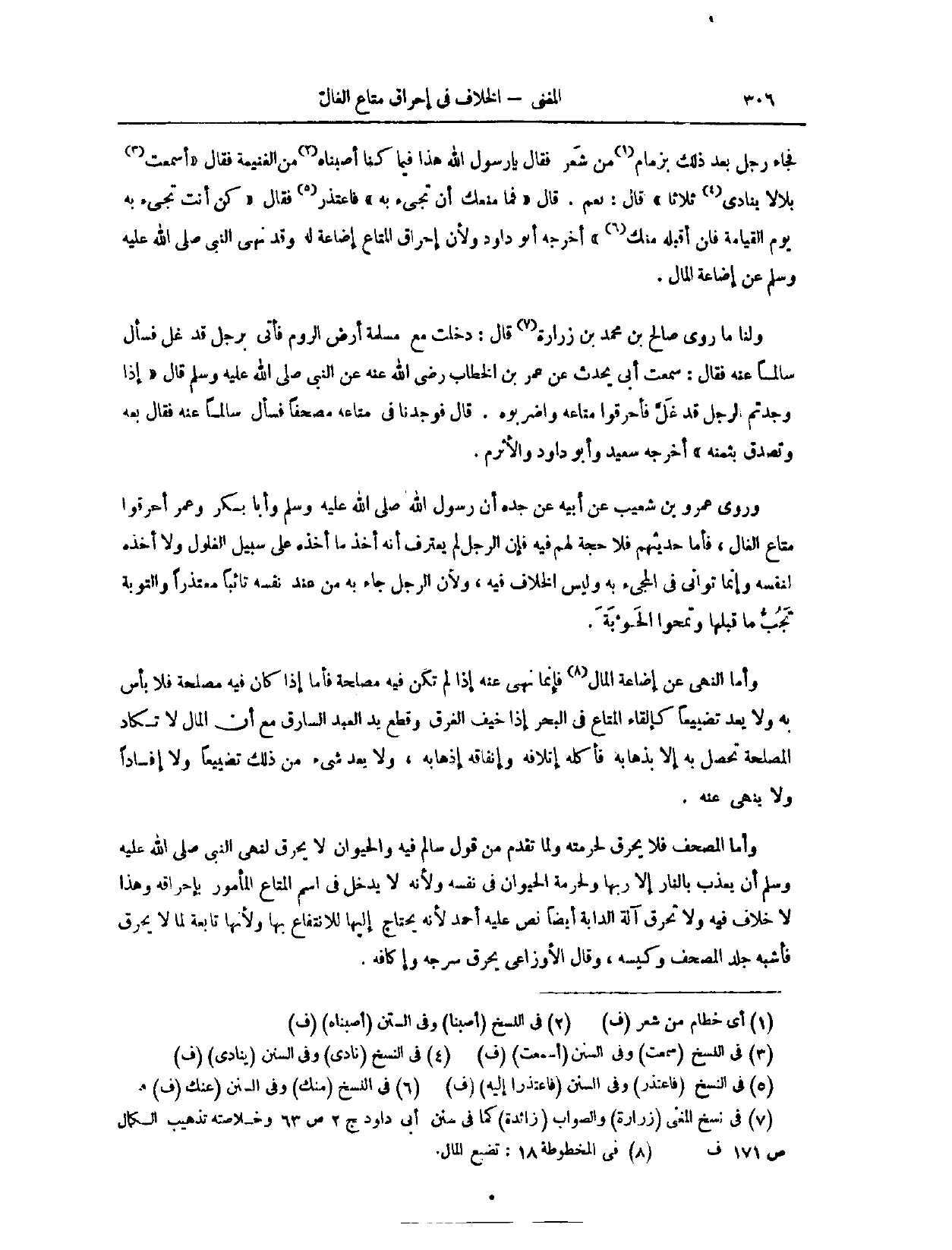 وَلِأَنَّ إحْرَاقَ الْمَتَاعِ إضَاعَةٌ لَهُ، وَقَدْ «نَهَى النَّبِيُّ - صَلَّى اللَّهُ عَلَيْهِ وَسَلَّمَ - عَنْ إضَاعَةِ الْمَالِ.» وَلَنَا؛ مَا رَوَى صَالِحُ بْنُ مُحَمَّدِ بْنِ زُرَارَةَ، قَالَ: دَخَلْت مَعَ مَسْلَمَةَ أَرْضَ الرُّومِ، فَأُتِيَ بِرَجُلٍ قَدْ غَلَّ، فَسَأَلَ سَالِمًا عَنْهُ، فَقَالَ: سَمِعْت أَبِي يُحَدِّثُ عَنْ عُمَرَ بْنِ الْخَطَّابِ - رَضِيَ اللَّهُ عَنْهُ - عَنْ النَّبِيِّ - صَلَّى اللَّهُ عَلَيْهِ وَسَلَّمَ - قَالَ: «إذَا وَجَدْتُمْ الرَّجُلَ قَدْ غَلَّ، فَاحْرِقُوا مَتَاعَهُ، وَاضْرِبُوهُ» . قَالَ فَوَجَدْنَا فِي مَتَاعِهِ مُصْحَفًا، فَسَأَلَ سَالِمًا عَنْهُ، فَقَالَ: بِعْهُ، وَتَصَدَّقْ بِثَمَنِهِ. أَخْرَجَهُ سَعِيدٌ، وَأَبُو دَاوُد، وَالْأَثْرَمُ.
