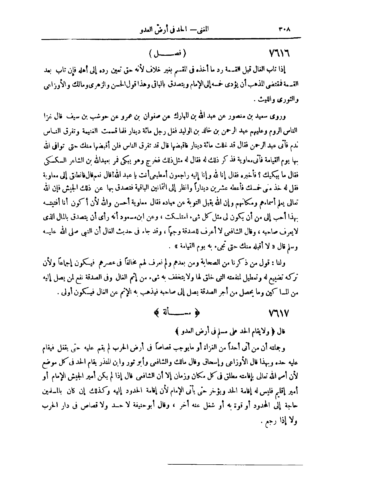 (٧٦٠٨) مَسْأَلَةٌ؛ قَالَ: وَلَا يُقَامُ الْحَدُّ عَلَى مُسْلِمٍ فِي أَرْضِ الْعَدُوِّ. وَجُمْلَتُهُ أَنَّ مَنْ أَتَى حَدًّا مِنْ الْغُزَاةِ، أَوْ مَا يُوجِبُ قِصَاصًا، فِي أَرْضِ الْحَرْبِ، لَمْ يُقَمْ عَلَيْهِ حَتَّى يَقْفِلَ، فَيُقَامَ عَلَيْهِ حَدُّهُ. وَبِهَذَا قَالَ الْأَوْزَاعِيُّ، وَإِسْحَاقُ. وَقَالَ مَالِكٌ، وَالشَّافِعِيُّ، وَأَبُو ثَوْرٍ، وَابْنُ الْمُنْذِرِ: يُقَامُ الْحَدُّ فِي كُلِّ مَوْضِعٍ؛ لِأَنَّ أَمْرَ اللَّهِ تَعَالَى بِإِقَامَتِهِ مُطْلَقٌ فِي كُلِّ مَكَان وَزَمَانٍ، إلَّا أَنَّ الشَّافِعِيَّ قَالَ: إذَا لَمْ يَكُنْ أَمِيرُ الْجَيْشِ الْإِمَامَ، أَوْ أَمِيرَ إقْلِيمٍ، فَلَيْسَ لَهُ إقَامَةُ الْحَدِّ، وَيُؤَخَّرُ حَتَّى يَأْتِيَ الْإِمَامَ؛ لِأَنَّ إقَامَةَ الْحُدُودِ إلَيْهِ، وَكَذَلِكَ إنْ كَانَ بِالْمُسْلِمِينَ حَاجَةٌ إلَى الْمَحْدُودِ، أَوْ قُوَّةٌ بِهِ، أَوْ شُغْلٌ عَنْهُ، أُخِّرَ. وَقَالَ أَبُو حَنِيفَةَ: لَا حَدَّ وَلَا قِصَاصَ فِي دَارِ الْحَرْبِ، وَلَا إذَا رَجَعَ.