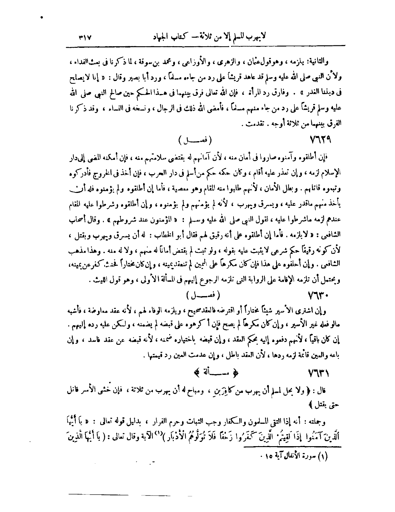 (٧٦٢٢) مَسْأَلَةٌ قَالَ (وَلَا يَحِلُّ لِمُسْلِمٍ أَنْ يَهْرَبَ مِنْ كَافِرَيْنِ، وَمُبَاحٌ لَهُ أَنْ يَهْرَبَ مِنْ ثَلَاثَةٍ، فَإِنْ خَشِيَ الْأَسْرَ، قَاتَلَ حَتَّى يُقْتَلَ) وَجُمْلَتُهُ أَنَّهُ إذَا الْتَقَى الْمُسْلِمُونَ وَالْكُفَّارُ، وَجَبَ الثَّبَاتُ، وَحَرُمَ الْفِرَارُ بِدَلِيلِ قَوْله تَعَالَى: {يَا أَيُّهَا الَّذِينَ آمَنُوا إِذَا لَقِيتُمُ الَّذِينَ كَفَرُوا زَحْفًا فَلا تُوَلُّوهُمُ الأَدْبَارَ} [الأنفال: ١٥] الْآيَةَ وَقَالَ تَعَالَى: {يَا أَيُّهَا الَّذِينَ آمَنُوا إِذَا لَقِيتُمْ فِئَةً فَاثْبُتُوا وَاذْكُرُوا اللَّهَ كَثِيرًا لَعَلَّكُمْ تُفْلِحُونَ} [الأنفال: ٤٥] «