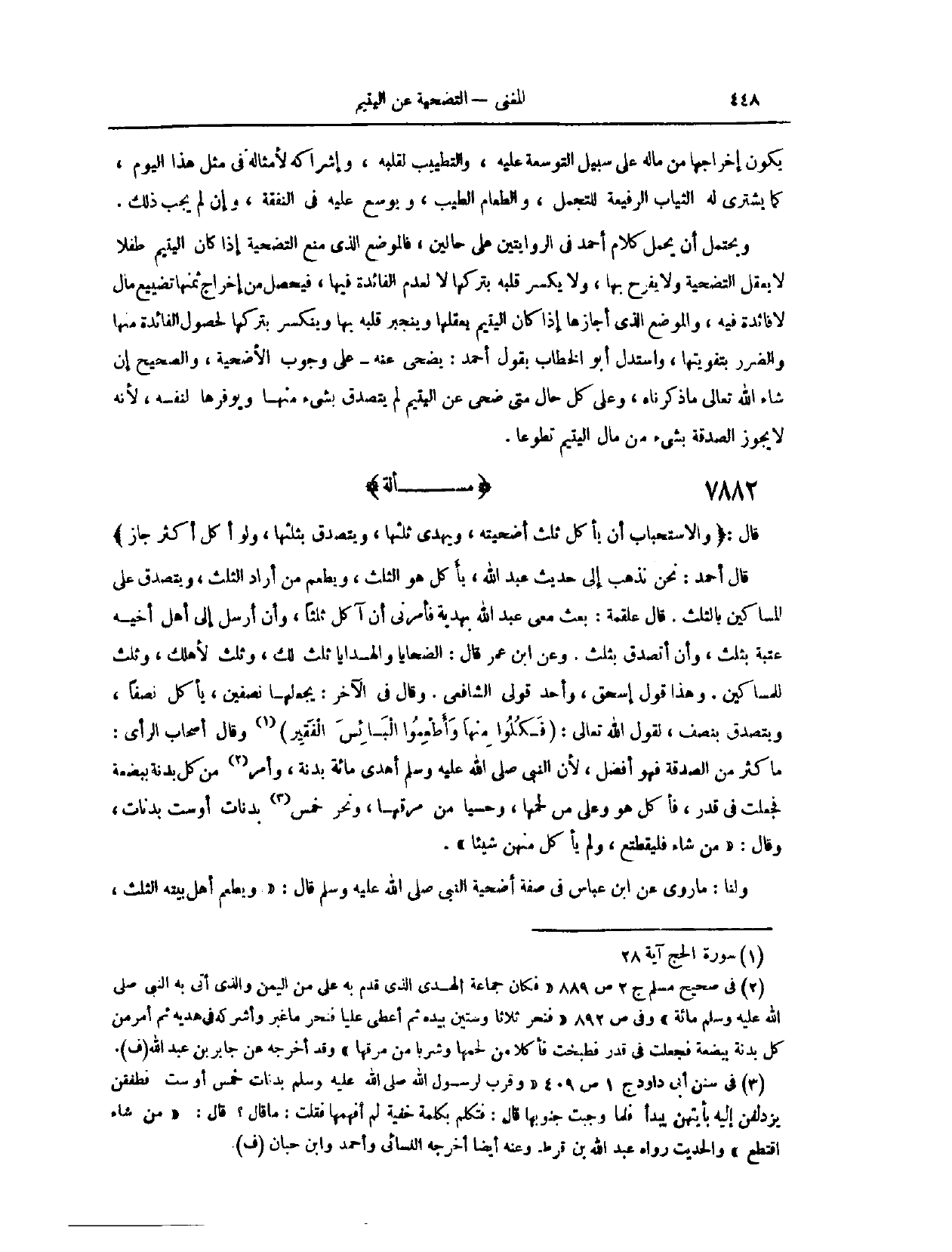 (٧٨٧٧) مَسْأَلَةٌ؛ قَالَ: وَالِاسْتِحْبَابُ أَنْ يَأْكُلَ ثُلُثَ أُضْحِيَّتِهِ، وَيُهْدِيَ ثُلُثَهَا، وَيَتَصَدَّقَ بِثُلُثِهَا، وَلَوْ أَكَلَ أَكْثَرَ جَازَ قَالَ أَحْمَدُ: نَحْنُ نَذْهَبُ إلَى حَدِيثِ عَبْدِ اللَّهِ: يَأْكُلُ هُوَ الثُّلُثَ، وَيُطْعِمُ مَنْ أَرَادَ الثُّلُثَ، وَيَتَصَدَّقُ عَلَى الْمَسَاكِينِ بِالثُّلُثِ. قَالَ عَلْقَمَةُ: بَعَثَ مَعِي عَبْدُ اللَّهِ بِهَدِيَّةٍ، فَأَمَرَنِي أَنْ آكُلَ ثُلُثًا، وَأَنْ أُرْسِلَ إلَى أَهْلِ أَخِيهِ عُتْبَةَ بِثُلُثٍ، وَأَنْ أَتَصَدَّقَ بِثُلُثٍ، وَعَنْ ابْنِ عُمَرَ قَالَ: الضَّحَايَا وَالْهَدَايَا ثُلُثٌ لَك، وَثُلُثٌ لِأَهْلِك، وَثُلُثٌ لِلْمَسَاكِينِ. وَهَذَا قَوْلُ إِسْحَاقَ، وَأَحَدُ قَوْلَيْ الشَّافِعِيِّ وَقَالَ فِي الْآخَرِ: يَجْعَلُهَا نِصْفَيْنِ، يَأْكُلُ نِصْفًا، وَيَتَصَدَّقُ بِنِصْفٍ؛ لِقَوْلِ اللَّهِ تَعَالَى: {فَكُلُوا مِنْهَا وَأَطْعِمُوا الْبَائِسَ الْفَقِيرَ} [الحج: ٢٨] .