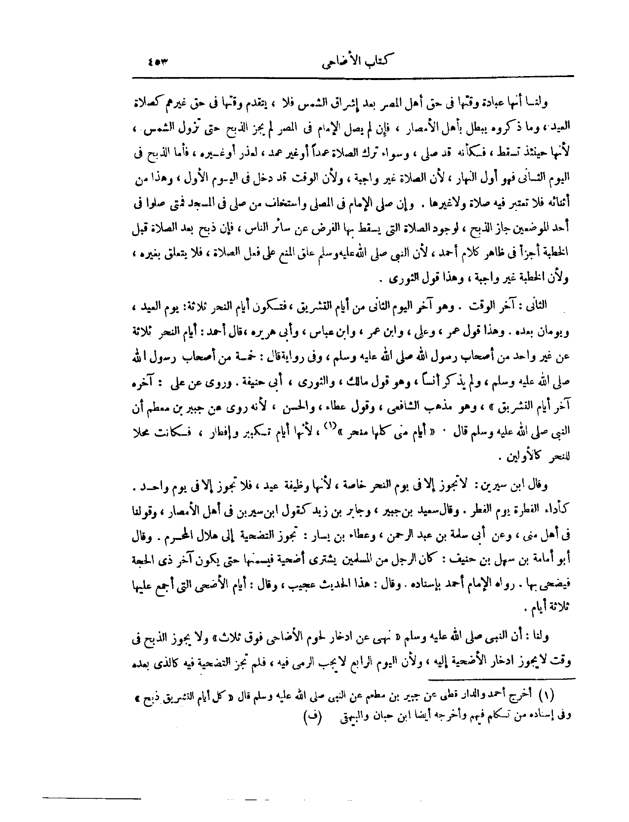 الثَّانِي، آخِرُ الْوَقْتِ، وَآخِرُهُ آخِرُ الْيَوْمِ الثَّانِي مِنْ أَيَّامِ التَّشْرِيقِ فَتَكُونُ أَيَّامُ النَّحْرِ ثَلَاثَةً؛ يَوْمُ الْعِيدِ، وَيَوْمَانِ بَعْدَهُ. وَهَذَا قَوْلُ عُمَرَ، وَعَلِيٍّ، وَابْنِ عُمَرَ، وَابْنِ عَبَّاسٍ، وَأَبِي هُرَيْرَةَ، وَأَنَسٍ. قَالَ أَحْمَدُ: أَيَّامُ النَّحْرِ ثَلَاثَةٌ، عَنْ غَيْرِ وَاحِدٍ مِنْ أَصْحَابِ رَسُولِ اللَّهِ - صَلَّى اللَّهُ عَلَيْهِ وَسَلَّمَ -. وَفِي رِوَايَةٍ، قَالَ: خَمْسَةٌ مِنْ أَصْحَابِ رَسُولِ اللَّهِ - صَلَّى اللَّهُ عَلَيْهِ وَسَلَّمَ -. وَلَمْ يَذْكُرْ أَنَسًا. وَهُوَ قَوْلُ مَالِكٍ، وَالثَّوْرِيِّ، وَأَبِي حَنِيفَةَ. وَرُوِيَ عَنْ عَلِيٍّ، آخِرُ أَيَّامِ التَّشْرِيقِ. وَهُوَ مَذْهَبُ الشَّافِعِيِّ، وَقَوْلُ عَطَاءٍ، وَالْحَسَنِ؛ لِأَنَّهُ رُوِيَ عَنْ جُبَيْرِ بْنِ مُطْعِمٍ، أَنَّ النَّبِيَّ - صَلَّى اللَّهُ عَلَيْهِ وَسَلَّمَ - قَالَ: «أَيَّامُ مِنًى كُلُّهَا مَنْحَرٌ» . وَلِأَنَّهَا أَيَّامُ تَكْبِيرٍ وَإِفْطَارٍ، فَكَانَتْ مَحَلًّا لِلنَّحْرِ كَالْأَوَّلَيْنِ.