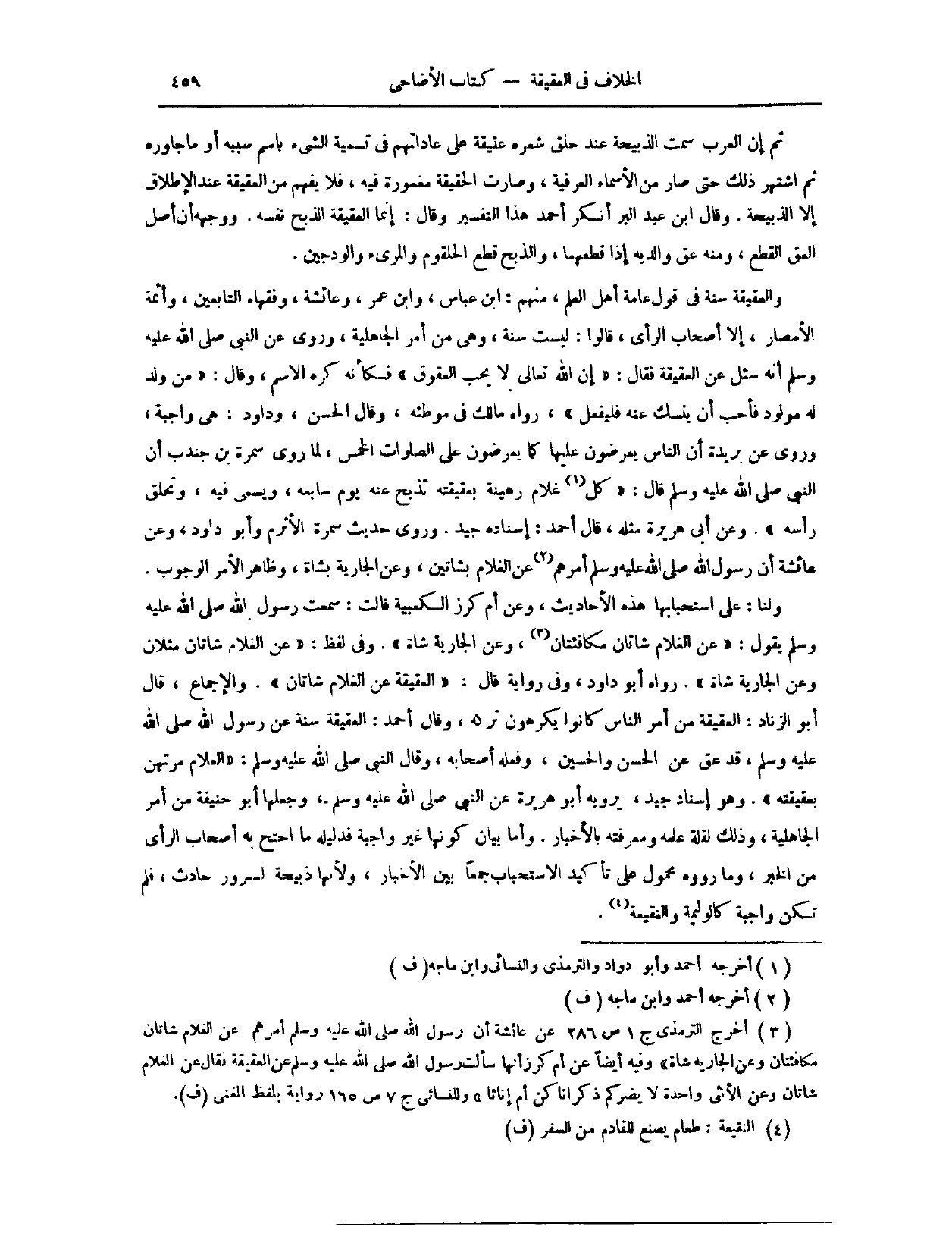 وَالْإِجْمَاعُ، قَالَ أَبُو الزِّنَادِ: الْعَقِيقَةُ مِنْ أَمْرِ النَّاسِ، كَانُوا يَكْرَهُونَ تَرْكَهُ. وَقَالَ أَحْمَدُ: الْعَقِيقَةُ سُنَّةٌ عَنْ رَسُولِ اللَّهِ - صَلَّى اللَّهُ عَلَيْهِ وَسَلَّمَ - قَدْ عَقَّ عَنْ الْحَسَنِ وَالْحُسَيْنِ، وَفَعَلَهُ أَصْحَابُهُ، وَقَالَ النَّبِيُّ - صَلَّى اللَّهُ عَلَيْهِ وَسَلَّمَ -: " الْغُلَامُ مُرْتَهَنٌ بِعَقِيقَتِهِ ". وَهُوَ إسْنَادٌ جَيِّدٌ، يَرْوِيهِ أَبُو هُرَيْرَةَ عَنْ النَّبِيِّ - صَلَّى اللَّهُ عَلَيْهِ وَسَلَّمَ -. وَجَعَلَهَا أَبُو حَنِيفَةَ مِنْ أَمْرِ الْجَاهِلِيَّةِ، وَذَلِكَ لِقِلَّةِ عِلْمِهِ وَمَعْرِفَتِهِ بِالْأَخْبَارِ. وَأَمَّا بَيَانُ كَوْنِهَا غَيْرَ وَاجِبَةٍ، فَدَلِيلُهُ مَا احْتَجَّ بِهِ أَصْحَابُ الرَّأْيِ مِنْ الْخَبَرِ، وَمَا رَوَوْهُ مَحْمُولٌ عَلَى تَأْكِيدِ الِاسْتِحْبَابِ، جَمْعًا بَيْنَ الْأَخْبَارِ، وَلِأَنَّهَا ذَبِيحَةٌ لِسُرُورٍ حَادِثٍ، فَلَمْ تَكُنْ وَاجِبَةً، كَالْوَلِيمَةِ وَالنَّقِيعَةِ.