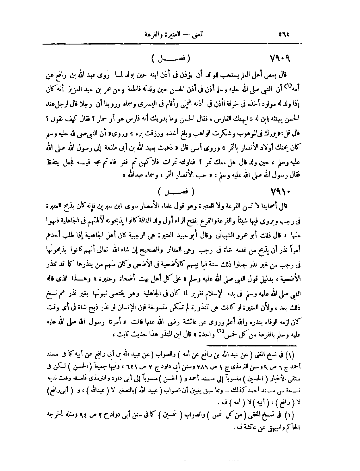 فَصْلٌ: قَالَ أَصْحَابُنَا: لَا تُسَنُّ الْفَرَعَةُ وَلَا الْعَتِيرَةُ. وَهُوَ قَوْلُ عُلَمَاءِ الْأَمْصَارِ سِوَى ابْنِ سِيرِينَ، فَإِنَّهُ كَانَ يَذْبَحُ الْعَتِيرَةَ فِي رَجَبٍ، وَيَرْوِي فِيهَا شَيْئًا. وَالْفَرَعَةُ وَالْفَرَعُ؛ بِفَتْحِ الرَّاءِ: أَوَّلُ وَلَدِ النَّاقَةِ. كَانُوا يَذْبَحُونَهُ لِآلِهَتِهِمْ فِي الْجَاهِلِيَّةِ فَنُهُوا عَنْهَا. قَالَ ذَلِكَ أَبُو عَمْرٍو الشَّيْبَانِيُّ. وَقَالَ أَبُو عُبَيْدٍ الْعَتِيرَةُ هِيَ الرَّجَبِيَّةُ، كَانَ أَهْلُ الْجَاهِلِيَّةِ إذَا طَلَبَ أَحَدُهُمْ أَمْرًا، نَذَرَ أَنْ يَذْبَحَ مِنْ غَنَمِهِ شَاةً فِي رَجَبٍ، وَهِيَ الْعَتَائِرُ. وَالصَّحِيحُ، إنْ شَاءَ اللَّهُ تَعَالَى، أَنَّهُمْ كَانُوا يَذْبَحُونَهَا فِي رَجَبٍ مِنْ غَيْرِ نَذْرٍ، جَعَلُوا ذَلِكَ سُنَّةً فِيمَا بَيْنَهُمْ، كَالْأُضْحِيَّةِ فِي الْأَضْحَى، وَكَانَ مِنْهُمْ مَنْ يَنْذِرُهَا كَمَا قَدْ تُنْذَرُ الْأُضْحِيَّةِ، بِدَلِيلِ قَوْلِ النَّبِيِّ - صَلَّى اللَّهُ عَلَيْهِ وَسَلَّمَ - «عَلَى كُلِّ أَهْلِ بَيْتٍ أَضْحَاةٌ وَعَتِيرَةٌ» . وَهَذَا الَّذِي قَالَهُ النَّبِيُّ - صَلَّى اللَّهُ عَلَيْهِ وَسَلَّمَ - فِي بَدْءِ الْإِسْلَامِ تَقْرِيرٌ لِمَا كَانَ فِي الْجَاهِلِيَّةِ، وَهُوَ يَقْتَضِي ثُبُوتَهَا بِغَيْرِ نَذْرٍ، ثُمَّ نُسِخَ ذَلِكَ بَعْدُ. وَلِأَنَّ الْعَتِيرَةَ لَوْ كَانَتْ هِيَ الْمَنْذُورَةَ لَمْ تَكُنْ مَنْسُوخَةً، فَإِنَّ الْإِنْسَانَ لَوْ نَذَرَ ذَبْحَ شَاةٍ فِي أَيِّ وَقْتٍ كَانَ، لَزِمَهُ الْوَفَاءُ بِنَذْرِهِ. وَاَللَّه أَعْلَمُ.