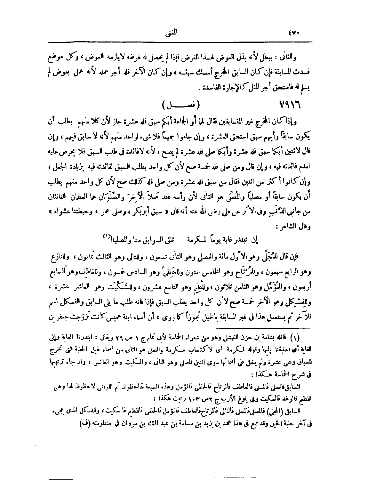 (٧٩١١) فَصْلٌ: وَإِذَا كَانَ الْمُخْرِجُ غَيْرَ الْمُتَسَابِقَيْنِ، فَقَالَ لَهُمَا أَوْ لِجَمَاعَةٍ: أَيُّكُمْ سَبَقَ فَلَهُ عَشَرَةٌ. جَازَ؛ لِأَنَّ كُلَّ وَاحِدٍ مِنْهُمَا يَطْلُبُ أَنْ يَكُونَ سَابِقًا، وَأَيُّهُمْ سَبَقَ، اسْتَحَقَّ الْعَشَرَةَ، وَإِنْ جَاءُوا جَمِيعًا، فَلَا شَيْءَ لِوَاحِدٍ مِنْهُمْ؛ لِأَنَّهُ لَا سَابِقَ فِيهِمْ. وَإِنْ قَالَ لِاثْنَيْنِ: أَيّكُمَا سَبَقَ فَلَهُ عَشَرَةٌ، وَأَيُّكُمَا صَلَّى فَلَهُ عَشَرَةٌ. لَمْ يَصِحَّ؛ لِأَنَّهُ لَا فَائِدَةَ فِي طَلَبِ السَّبْقِ، فَلَا يَحْرِصُ عَلَيْهِ، لِعَدَمِ فَائِدَتِهِ فِيهِ. وَإِنْ قَالَ: وَمَنْ صَلَّى فَلَهُ خَمْسَةٌ صَحَّ؛ لِأَنَّ كُلَّ وَاحِدٍ يَطْلُبُ السَّبْقَ لِفَائِدَتِهِ فِيهِ بِزِيَادَةِ الْجُعْلِ. وَإِنْ كَانُوا أَكْثَرَ مِنْ اثْنَيْنِ، فَقَالَ: مَنْ سَبَقَ فَلَهُ عَشَرَةٌ، وَمَنْ صَلَّى فَلَهُ كَذَلِكَ. صَحَّ؛ لِأَنَّ كُلَّ وَاحِدٍ مِنْهُمْ يَطْلُبُ أَنْ يَكُونَ سَابِقًا أَوْ مُصَلِّيًا، وَالْمُصَلِّي هُوَ الثَّانِي؛ لِأَنَّ رَأْسَهُ عِنْدَ صَلَى الْآخَرِ، وَالصَّلَوَانِ: هُمَا الْعَظْمَانِ النَّاتِئَانِ مِنْ جَانِبَيْ الذَّنَبِ.
