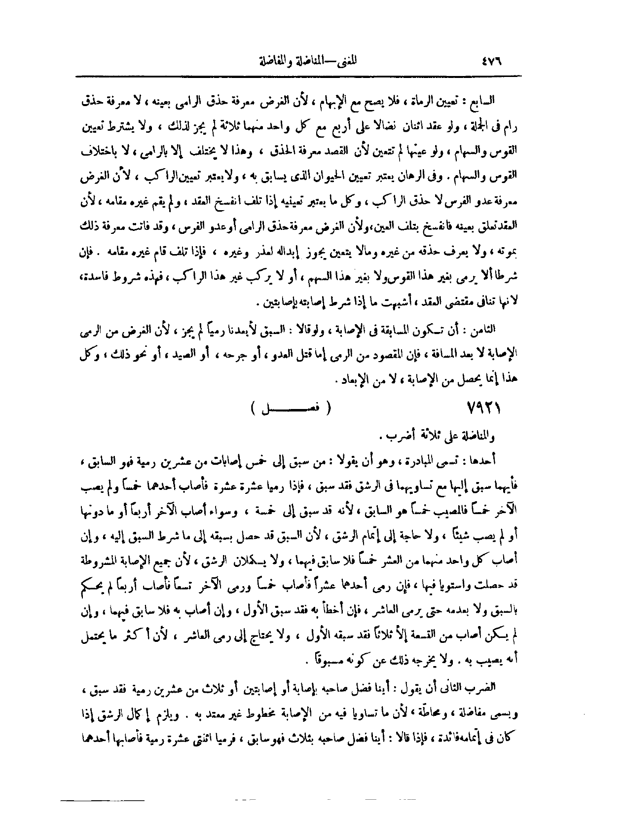 (٧٩١٧) فَصْلٌ: وَالْمُنَاضَلَةُ عَلَى ثَلَاثَةِ أَضْرُبٍ؛ أَحَدُهَا، تُسَمَّى الْمُبَادَرَةَ، وَهُوَ أَنْ يَقُولَا: مَنْ سَبَقَ إلَى خَمْسِ إصَابَاتٍ مِنْ عِشْرِينَ رَمْيَةً فَهُوَ السَّابِقُ. فَأَيُّهُمَا سَبَقَ إلَيْهَا مَعَ تَسَاوِيهِمَا فِي الرَّشْقِ، فَقَدْ سَبَقَ.