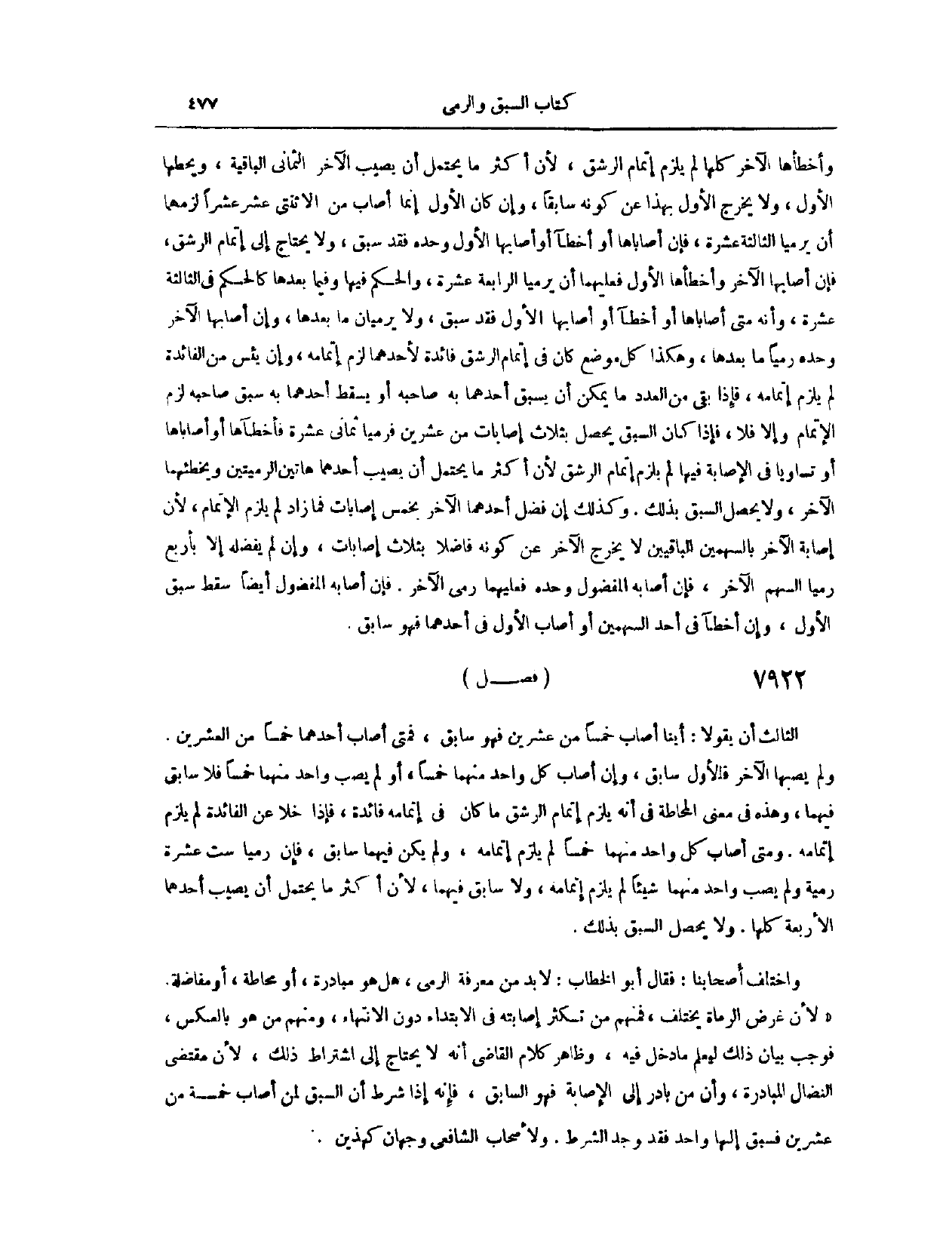 وَهَكَذَا كُلُّ مَوْضِعٍ كَانَ فِي إتْمَامِ، الرَّشْقِ فَائِدَةٌ لِأَحَدِهِمَا لَزِمَ إتْمَامُهُ، وَإِنْ يَئِسَ مِنْ الْفَائِدَةِ، لَمْ يَلْزَمْ إتْمَامُهُ، فَإِذَا بَقِيَ مِنْ الْعَدَدِ مَا يُمْكِنُ أَنْ يَسْبِقَ أَحَدُهُمَا بِهِ صَاحِبَهُ، أَوْ يُسْقِطَ أَحَدُهُمَا بِهِ سَبْقَ صَاحِبِهِ، لَزِمَ الْإِتْمَامُ، وَإِلَّا فَلَا، فَإِذَا كَانَ السَّبْقُ يَحْصُلُ بِثَلَاثِ إصَابَاتٍ مِنْ عِشْرِينَ، فَرَمَيَا ثَمَانِي عَشْرَةَ، فَأَخْطَآهَا، أَوْ أَصَابَاهَا، أَوْ تَسَاوَيَا فِي الْإِصَابَةِ فِيهَا، لَمْ يَلْزَمْ إتْمَامُ الرَّشْقِ لِأَنَّ؛ أَكْثَرَ مَا يُحْتَمَلُ أَنْ يُصِيبَ أَحَدُهُمَا هَاتَيْنِ الرَّمْيَتَيْنِ، وَيُخْطِئَهُمَا الْآخَرُ، وَلَا يَحْصُلُ السَّبْقُ بِذَلِكَ.
