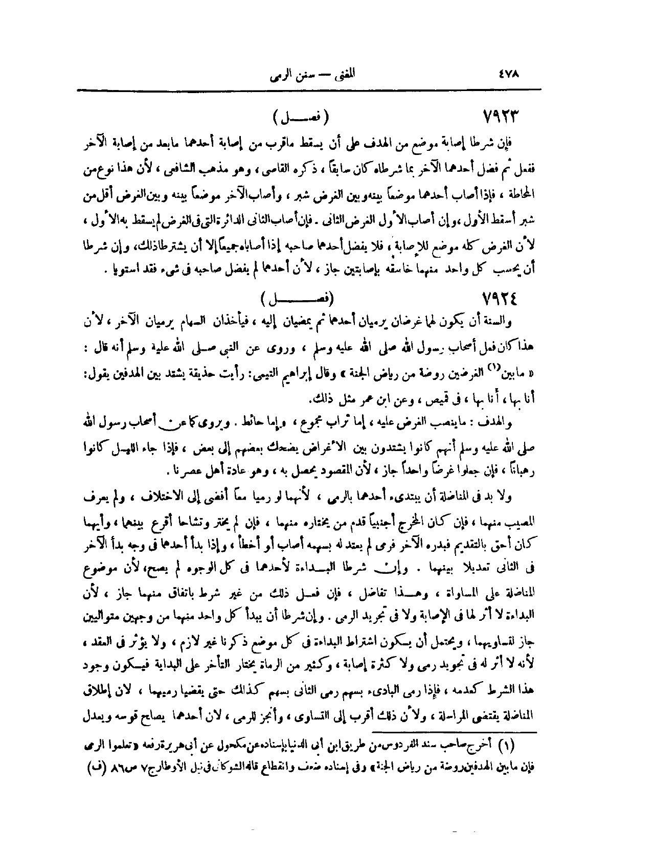 (٧٩١٩) فَصْلٌ فَإِنْ شَرَطَا إصَابَةَ مَوْضِعٍ مِنْ الْهَدَفِ، عَلَى أَنْ يَسْقُطَ مَا قَرُبَ مِنْ إصَابَةِ أَحَدِهِمَا مَا بَعُدَ مِنْ إصَابَةِ الْآخَرِ، فَفَعَلَ، ثُمَّ فَضَلَ أَحَدُهُمَا الْآخَرَ بِمَا شَرَطَاهُ، كَانَ سَابِقًا. ذَكَرَهُ الْقَاضِي. وَهُوَ مَذْهَبُ الشَّافِعِيِّ؛ لِأَنَّ هَذَا نَوْعٌ مِنْ الْمُحَاطَّةِ، فَإِذَا أَصَابَ أَحَدُهُمَا مَوْضِعًا بَيْنَهُ وَبَيْنَ الْغَرَضِ شِبْرٌ، وَأَصَابَ الْآخَرُ مَوْضِعًا بَيْنَهُ وَبَيْنَ الْغَرَضِ أَقَلُّ مِنْ شِبْرٍ، أَسْقَطَ الْأَوَّلَ، وَأَنْ أَصَابَ الْأَوَّلُ الْغَرَضَ، أَسْقَطَ الثَّانِيَ، فَإِنْ أَصَابَ الثَّانِي الدَّائِرَةَ الَّتِي فِي الْغَرَضِ، لَمْ يُسْقِطْ بِهِ الْأَوَّلَ؛ لِأَنَّ الْغَرَضَ كُلَّهُ مَوْضِعٌ لِلْإِصَابَةِ، فَلَا يَفْضُلُ أَحَدُهُمَا صَاحِبَهُ إذَا أَصَابَاهُ جَمِيعًا إلَّا أَنْ يَشْتَرِطَا ذَلِكَ. وَإِنْ شَرَطَا إنْ يَحْسِبَ كُلُّ وَاحِدٍ مِنْهُمَا خَاسِقَهُ بِإِصَابَتَيْنِ، جَازَ لِأَنَّ أَحَدَهُمَا لَمْ يَفْضُلْ صَاحِبَهُ فِي شَيْءٍ، فَقَدْ اسْتَوَيَا.