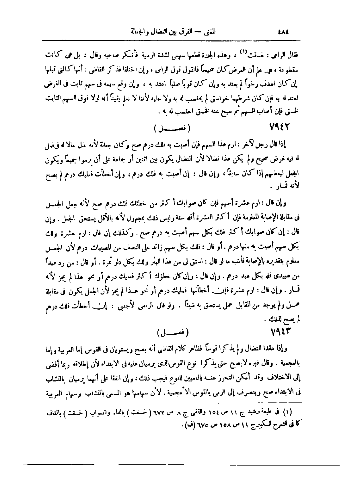 (٧٩٣٦) فَصْلٌ: إذَا قَالَ رَجُلٌ لِآخَرَ: ارْمِ هَذَا السَّهْمَ، فَإِنْ أَصَبْت بِهِ، فَلَكَ دِرْهَمٌ. صَحَّ، وَكَانَ جَعَالَةً؛ لِأَنَّهُ بَذَلَ مَالًا لَهُ فِي فِعْلٍ لَهُ فِيهِ غَرَضٌ صَحِيحٌ، وَلَمْ يَكُنْ هَذَا نِضَالًا؛ لِأَنَّ النِّضَالَ يَكُونُ بَيْنَ اثْنَيْنِ أَوْ جَمَاعَةٍ عَلَى أَنْ يَرْمُوا جَمِيعًا، وَيَكُونُ الْجُعْلُ لِبَعْضِهِمْ إذَا كَانَ سَابِقًا. وَإِنْ قَالَ: إنْ أَصَبْت بِهِ فَلَكَ دِرْهَمٌ، وَإِنْ أَخْطَأْت فَعَلَيْك دِرْهَمٌ. لَمْ يَصِحَّ؛ لِأَنَّهُ قِمَارٌ. وَإِنْ قَالَ: ارْمِ عَشَرَةَ أَسْهُمٍ، فَإِنْ كَانَ صَوَابُك أَكْثَرَ مِنْ خَطَئِك، فَلَكَ دِرْهَمٌ. صَحَّ؛ لِأَنَّهُ جَعَلَ الْجُعْلَ فِي مُقَابَلَةِ الْإِصَابَةِ الْمَعْلُومَةِ، فَإِنَّ أَكْثَرَ الْعَشَرَةِ أَقَلُّهُ سِتَّةٌ، وَلَيْسَ ذَلِكَ بِمَجْهُولٍ؛ لِأَنَّهُ بِالْأَقَلِّ يَسْتَحِقُّ الْجُعْلَ. وَإِنْ قَالَ: إنْ كَانَ صَوَابُك أَكْثَرَ، فَلَكَ بِكُلِّ سَهْمٍ أَصَبْت بِهِ دِرْهَمٌ. صَحَّ.