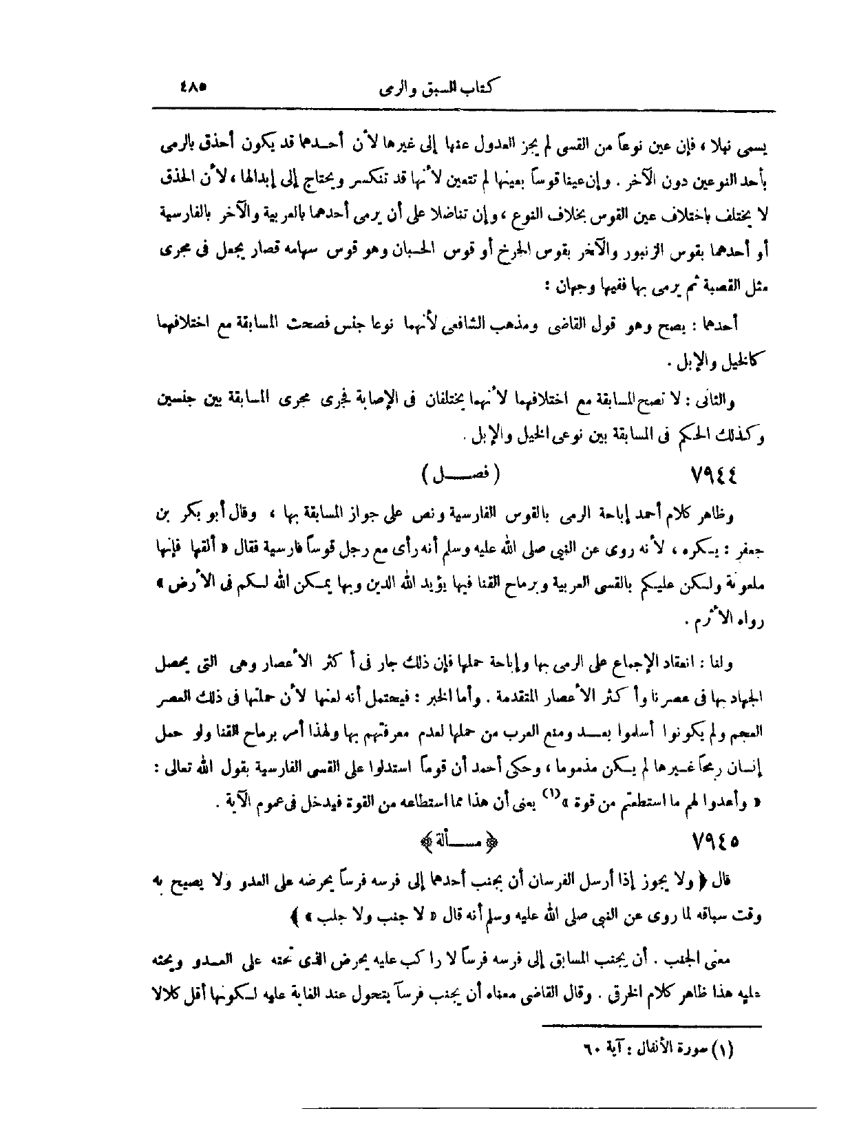 (٧٩٣٨) فَصْلٌ: وَظَاهِرُ كَلَامِ أَحْمَدَ إبَاحَةُ الرَّمْيِ بِالْقَوْسِ الْفَارِسِيَّةِ. وَنَصَّ عَلَى جَوَازِ الْمُسَابَقَةِ بِهَا، وَقَالَ أَبُو بَكْرِ بْنُ جَعْفَرٍ: يُكْرَهُ؛ لِأَنَّهُ رُوِيَ عَنْ النَّبِيِّ - صَلَّى اللَّهُ عَلَيْهِ وَسَلَّمَ - «أَنَّهُ رَأَى مَعَ رَجُلٍ قَوْسًا فَارِسِيَّةً، فَقَالَ: أَلْقِهَا، فَإِنَّهَا مَلْعُونَةٌ وَلَكِنْ عَلَيْكُمْ بِالْقِسِيِّ الْعَرَبِيَّةِ، وَبِرِمَاحِ الْقَنَا، فَبِهَا يُؤَيِّدُ اللَّهُ الدِّينَ، وَبِهَا يُمَكِّنُ اللَّهُ لَكُمْ فِي الْأَرْضِ» . رَوَاهُ الْأَثْرَمُ.