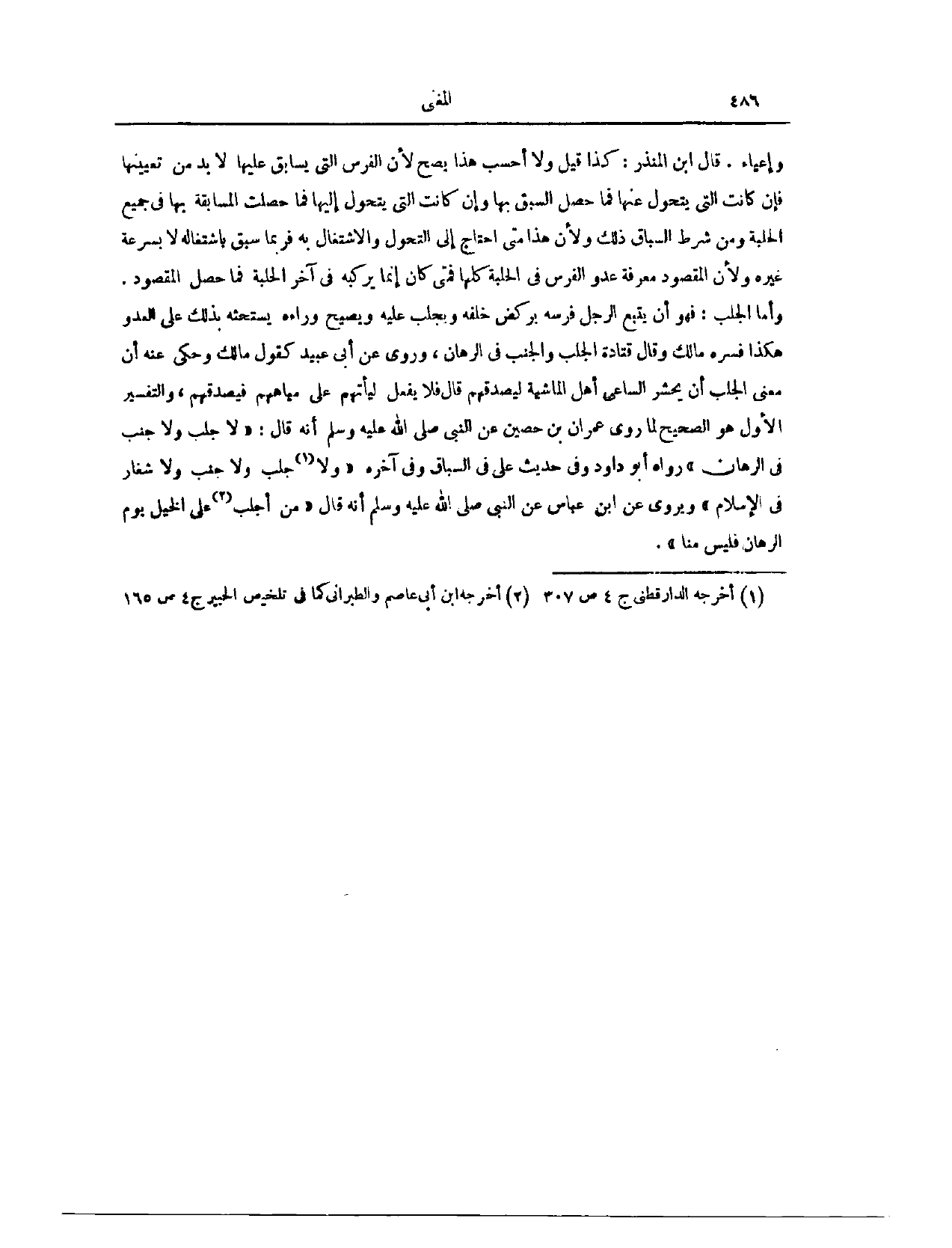 وَأَمَّا الْجَلَبُ، فَهُوَ أَنْ يَتْبَعَ الرَّجُلُ فَرَسَهُ، يَرْكُضُ خَلْفَهُ، وَيَجْلِبُ عَلَيْهِ، وَيَصِيحُ وَرَاءَهُ، يَسْتَحِثُّهُ بِذَلِكَ عَلَى الْعَدْوِ. هَكَذَا فَسَّرَهُ مَالِكٌ. وَقَالَ قَتَادَةُ: الْجَلَبُ وَالْجَنَبُ فِي الرِّهَانِ. وَرُوِيَ عَنْ أَبِي عُبَيْدٍ كَقَوْلِ مَالِكٍ. وَحُكِيَ عَنْهُ، أَنَّ مَعْنَى الْجَلَبِ أَنْ يَحْشُرَ السَّاعِي أَهْلَ الْمَاشِيَةِ لِيَصْدُقَهُمْ، قَالَ: فَلَا يَفْعَلْ، لِيَأْتِهِمْ عَلَى مِيَاهِهِمْ فَيَصْدُقَهُمْ. وَالتَّفْسِيرُ الْأَوَّلُ هُوَ الصَّحِيحُ؛ لِمَا رَوَى عِمْرَانُ بْنُ حُصَيْنٍ، عَنْ النَّبِيِّ - صَلَّى اللَّهُ عَلَيْهِ وَسَلَّمَ - أَنَّهُ قَالَ: «لَا جَلَبَ، وَلَا جَنَبَ فِي الرِّهَانِ» . رَوَاهُ أَبُو دَاوُد. وَفِي حَدِيثِ عَلِيٍّ فِي السِّبَاقِ وَفِي آخِرِهِ: «وَلَا جَلَبَ، وَلَا جَنَبَ، وَلَا شِغَارَ فِي الْإِسْلَامِ» . وَيُرْوَى عَنْ ابْنِ عَبَّاسٍ، عَنْ النَّبِيِّ - صَلَّى اللَّهُ عَلَيْهِ وَسَلَّمَ - أَنَّهُ قَالَ: «مَنْ أَجْلَبَ عَلَى الْخَيْلِ يَوْمَ الرِّهَانِ، فَلَيْسَ مِنَّا.»
